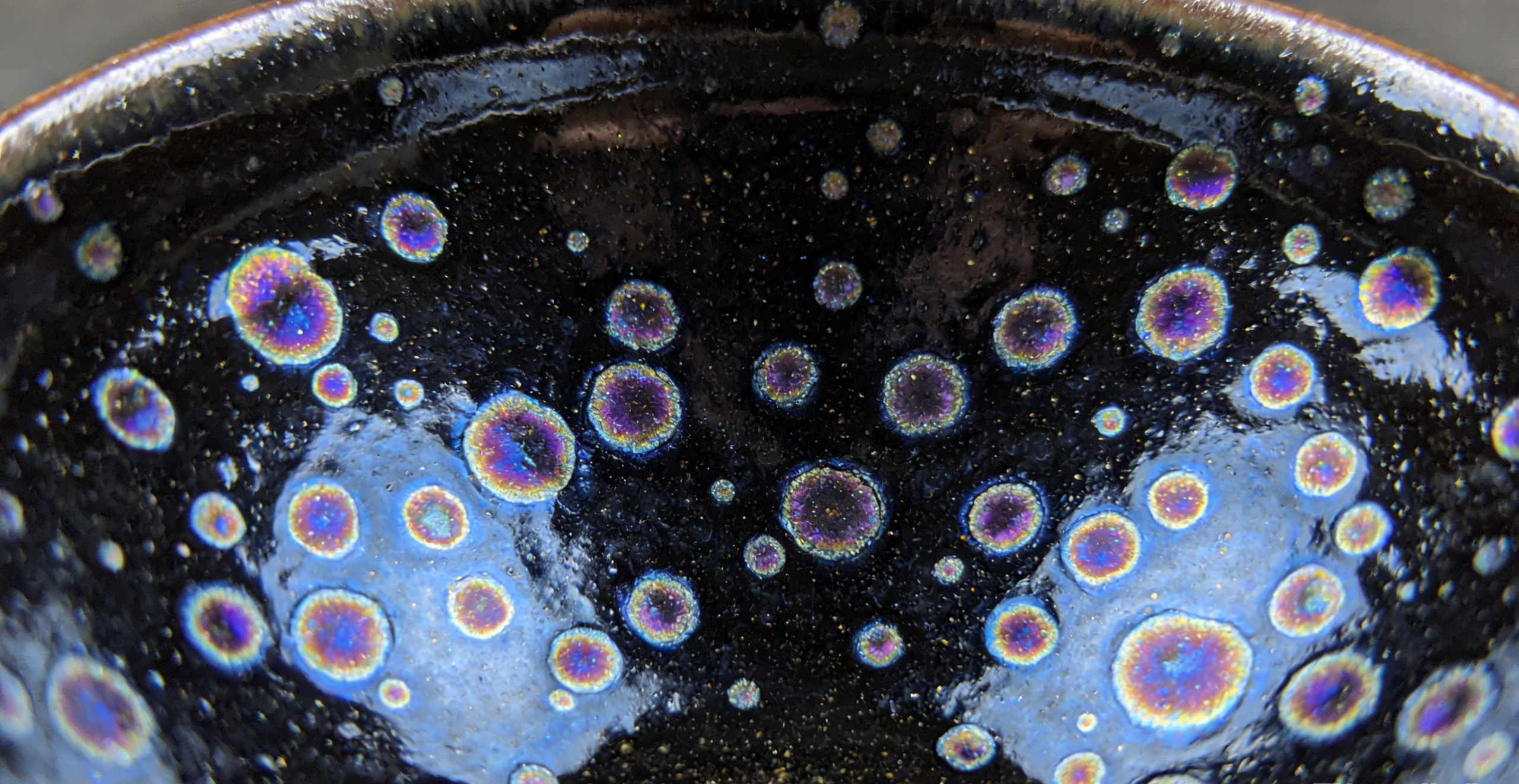 “Galaxy” is one of the most common names given to Yohen and Oil Spot Tenmoku bowls. The reason is simple: the glaze looks like the night sky.