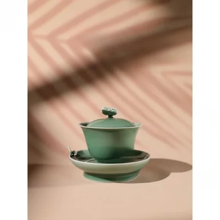 Longquan Celadon Handmade Sancai Covered Tea Cup Large Di-kiln Plum Green Tureen