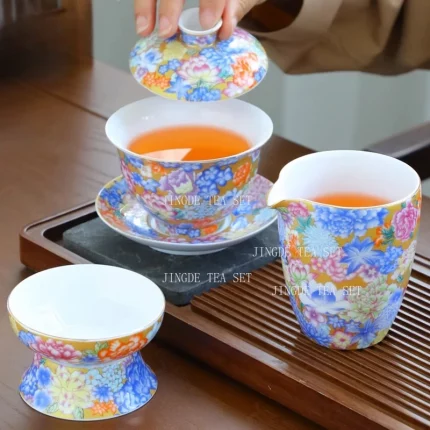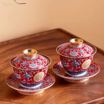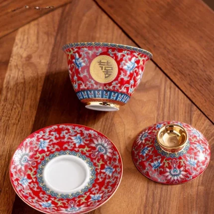 Chinese Wedding Tea Set Enamel Color Ceramic Gaiwan Handmade Beauty Teacup Custom Teaware Gift Exquisite Portable Tea Bowl