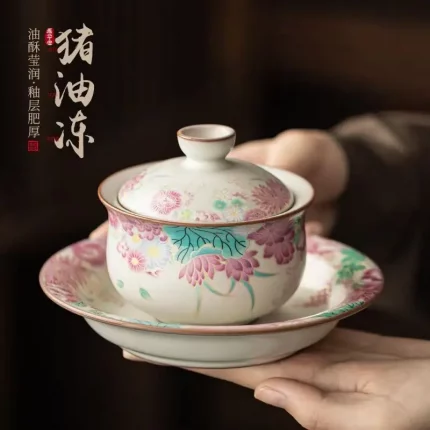 1Pc 170ML Lard Frozen Small Garden Sancai Gai Bowl Tea Bowl Kung Fu Tea Set Household Ceramic Teacup with Lid Tea Maker Gaiwan