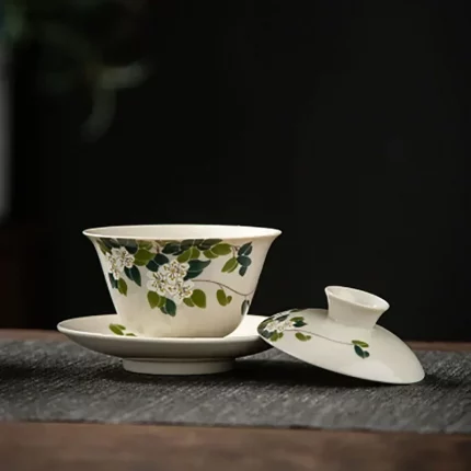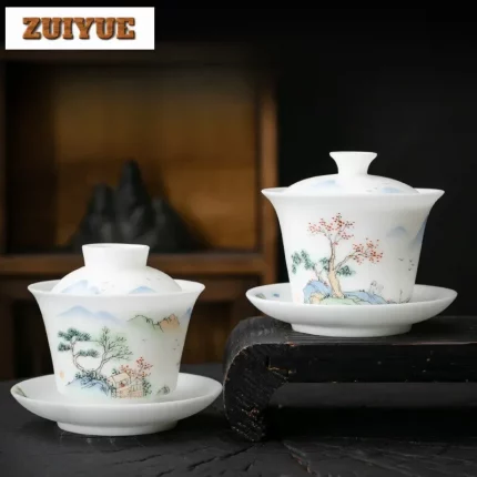 Boutique Ice Jade Porcelain Handmade Covered Bowl Handpainted Frangrant Hills Gaiwan Tea Tureen Tea Brewing Tea Collection Gifts