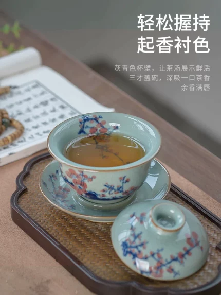 Porcelain Plant Ash Hydrangea Flowerr Pattern Sancai Gaiwan Kungfu Tea Tureen Tea Cup Household Infuser Bowl Kitchen Teaware