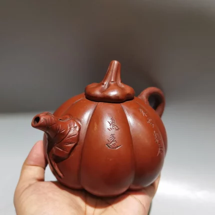 6″Chinese Yixing Purple Clay Teapot Pumpkin pot poetry Engraved pattern Kettle Teapot Flagon Amass wealth Ornaments Town house