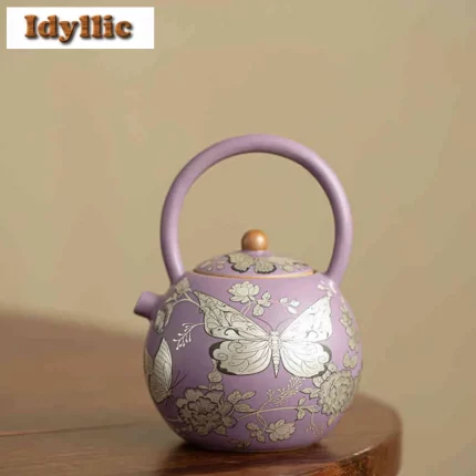 120ML Purple Ru Kiln Hand-painted Silver Butterfly Love Flower Gourd Pot Can Be Opened Ceramic Anti-scalding Teapot Kung Fu Gift