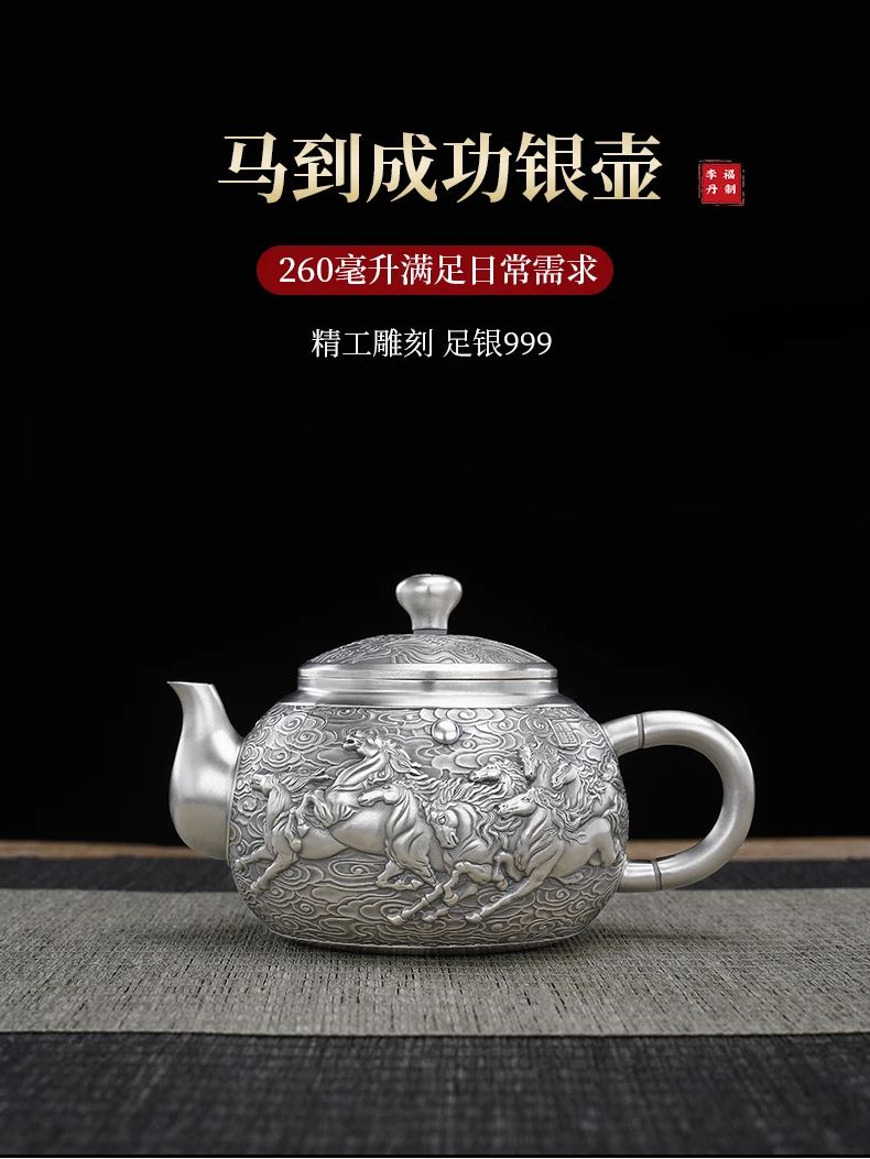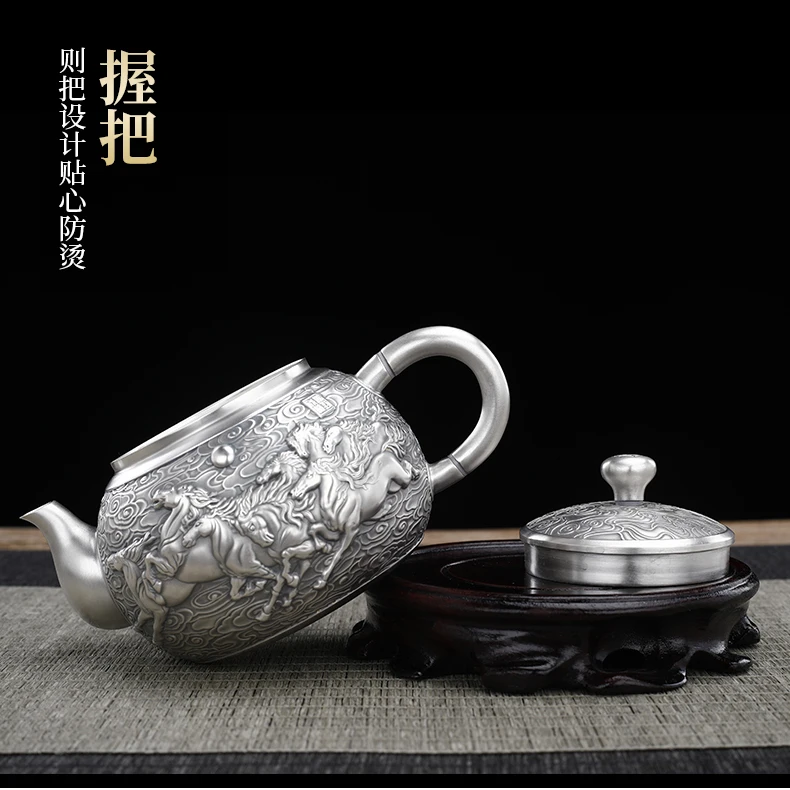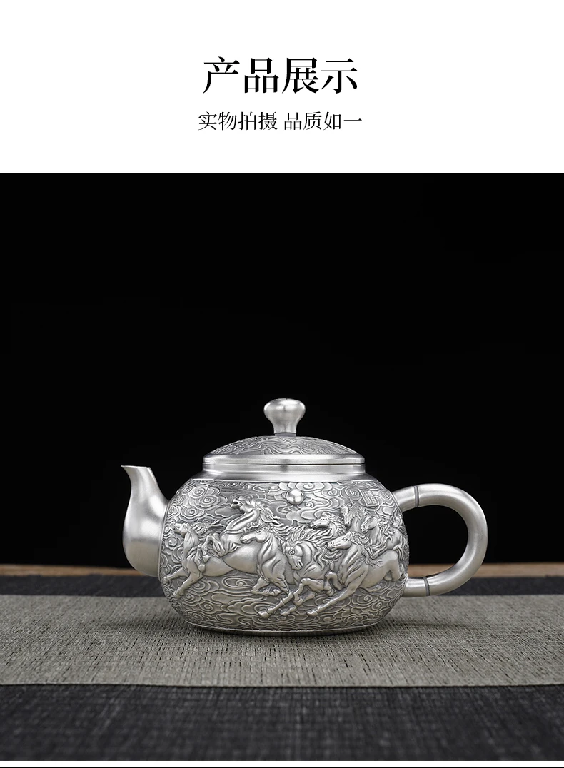 「万马奔腾壶 · Ten Thousand Galloping」 — 200ml Handcrafted 999 Sterling Silver Teapot (Embossed Horse Motif · Gongfu Tea Ceremony · Symbol of Vitality & Triumph)