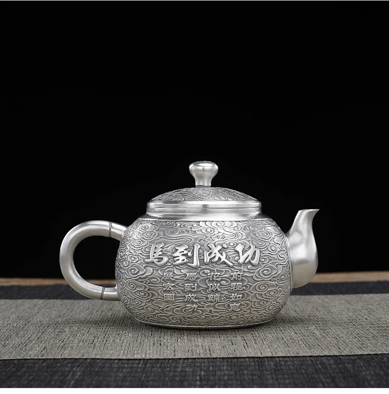 The Ten Thousand Galloping 万马奔腾壶 is a 200ml sterling silver teapot, meticulously handcrafted and adorned with a dynamic relief of galloping horses charging through swirling clouds. This motif, rich in cultural symbolism, evokes strength, freedom, and unstoppable momentum—making this teapot not only a functional vessel but a celebration of vitality and ambition.