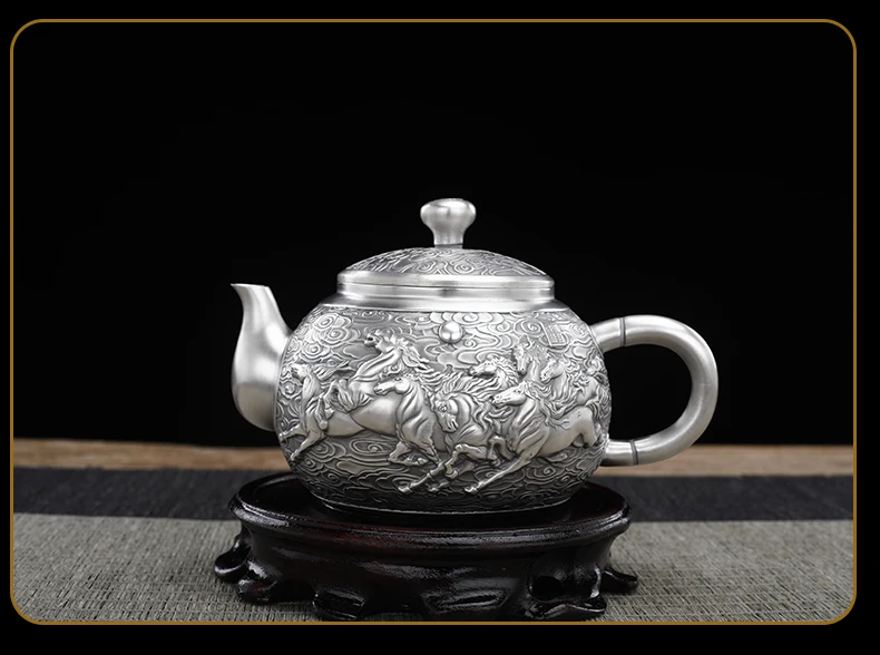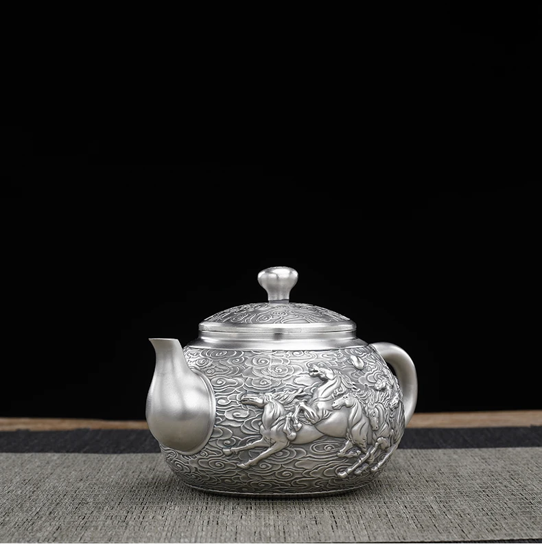 Design Highlight: The teapot’s rounded body is wrapped in a high-relief panorama of horses in motion, each rendered with expressive musculature and flowing manes. The looped handle and curved spout balance the form, while the lid is topped with a polished silver knob for ceremonial elegance.