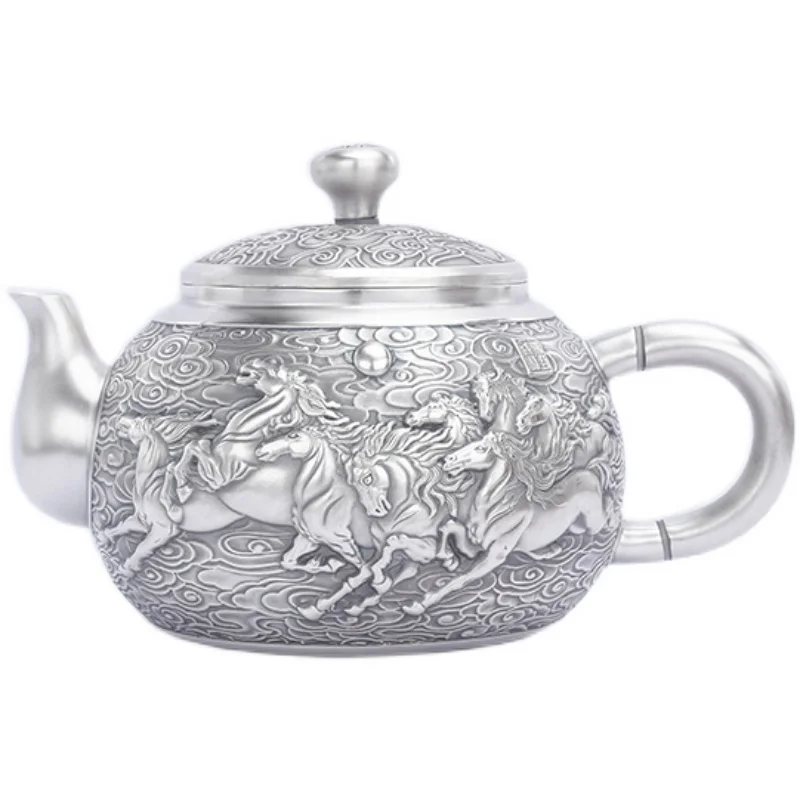 「万马奔腾壶 · Ten Thousand Galloping」 — 200ml Handcrafted 999 Sterling Silver Teapot (Embossed Horse Motif · Gongfu Tea Ceremony · Symbol of Vitality & Triumph)