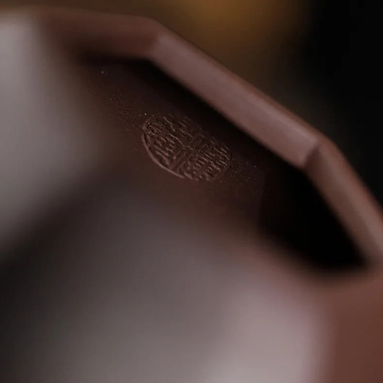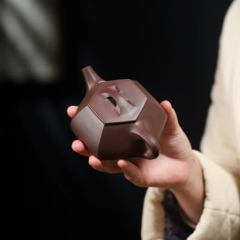 Crafted from raw ore purple clay (Zisha), the vessel honors the mineral richness of Yixing’s terroir. Its faceted body enhances heat distribution and visual impact, while the minimalist lid and handle preserve ergonomic balance.