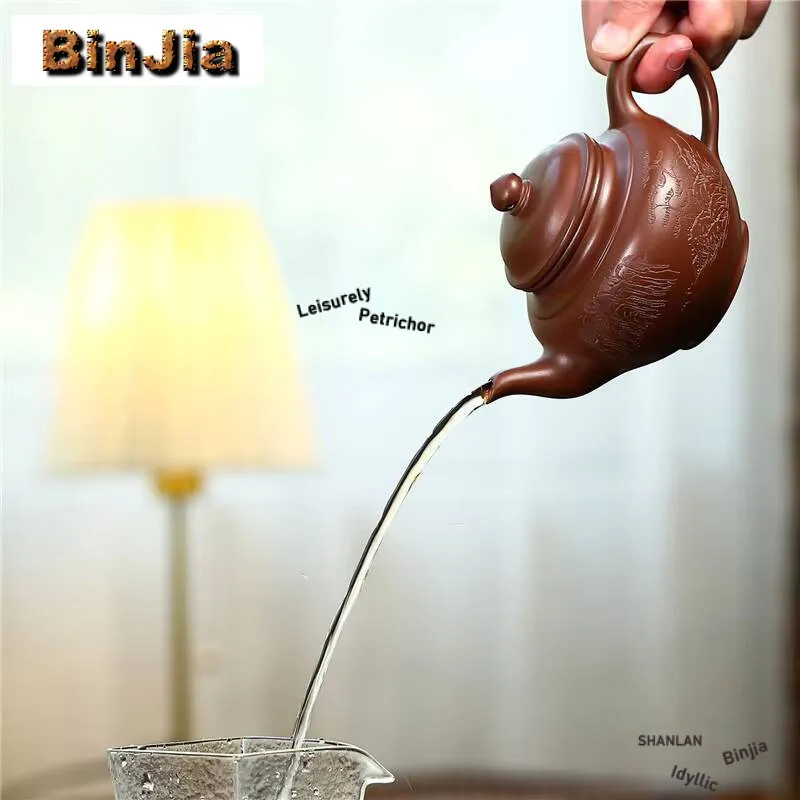 「山居壶 · Montaña Silenciosa」 — 260ml Handmade Yixing Purple Clay Teapot | Raw Ore Landscape Mud · Scenic Engraving · Gongfu Infuser Kettle · Zisha Craft Teaset
