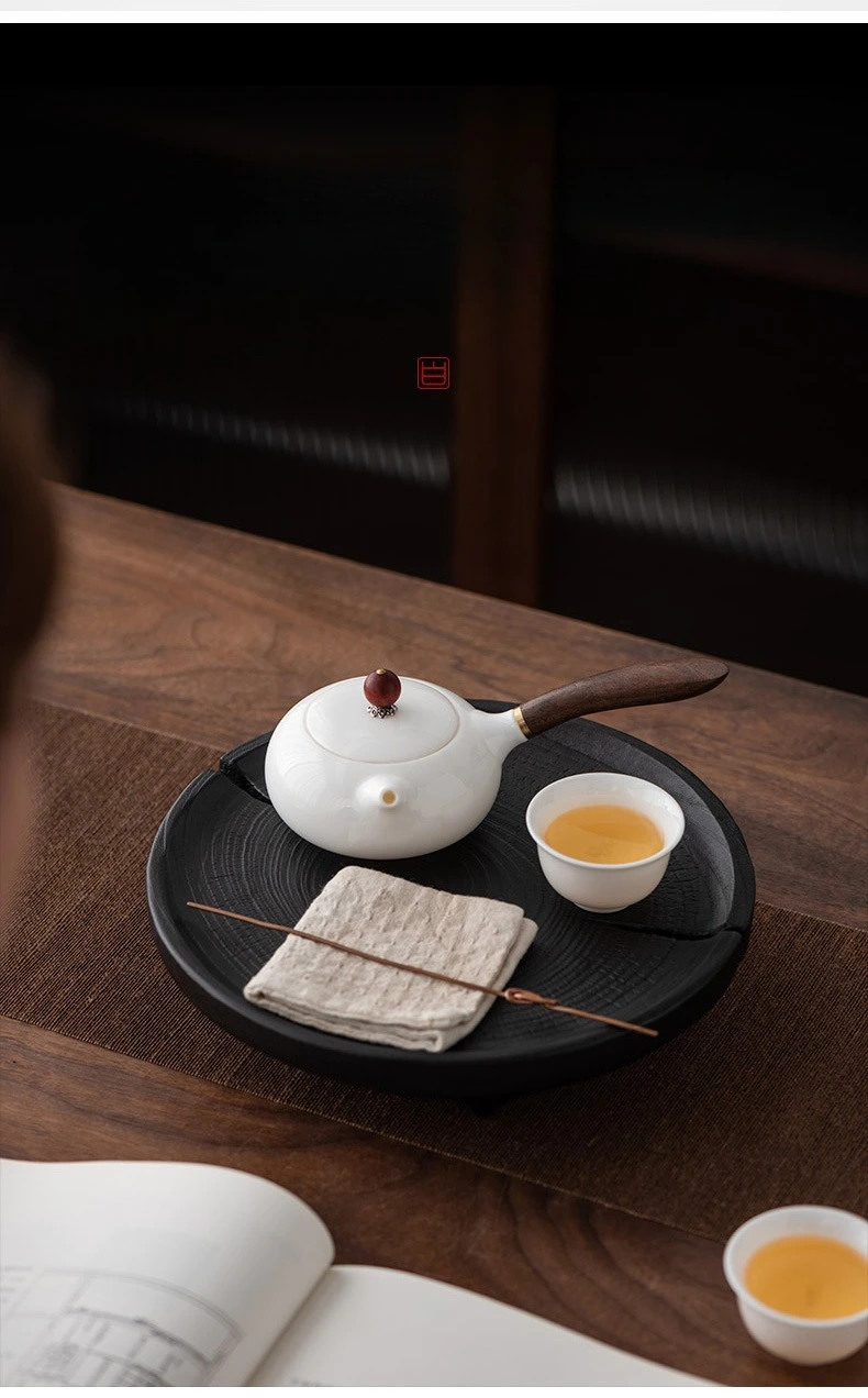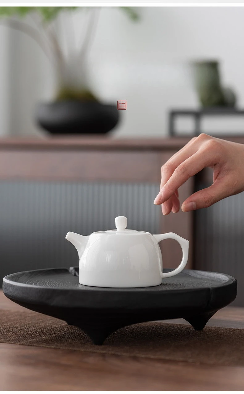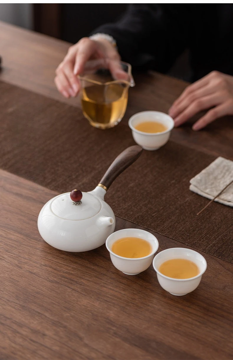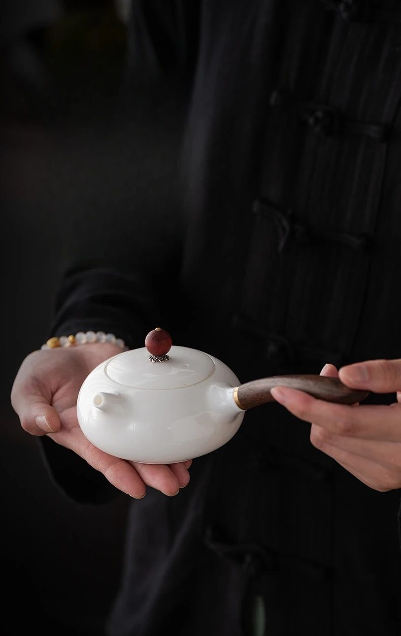 Its fusion of white porcelain and raw wood, side-handle design, and Xishi form make it a rare and elegant tea vessel.