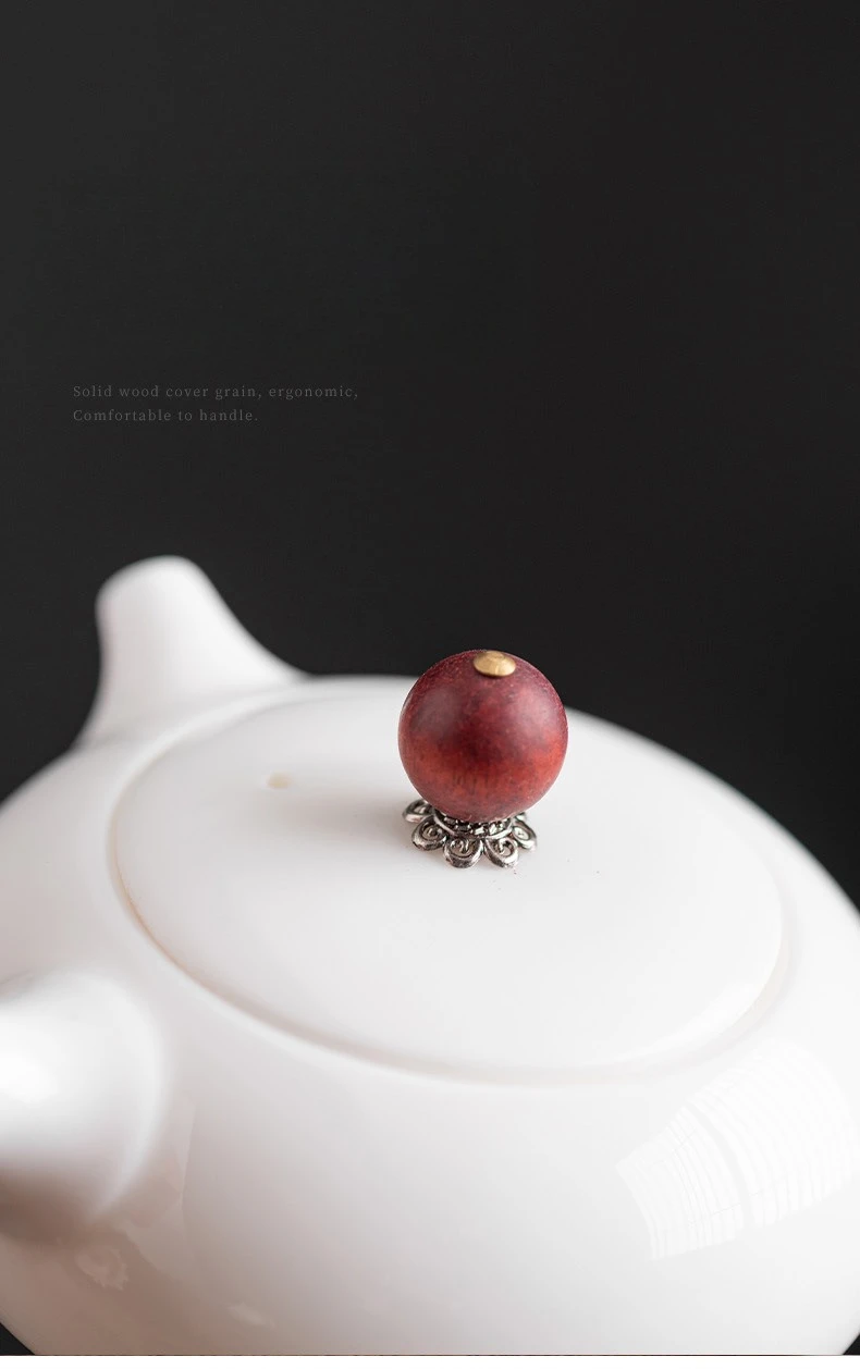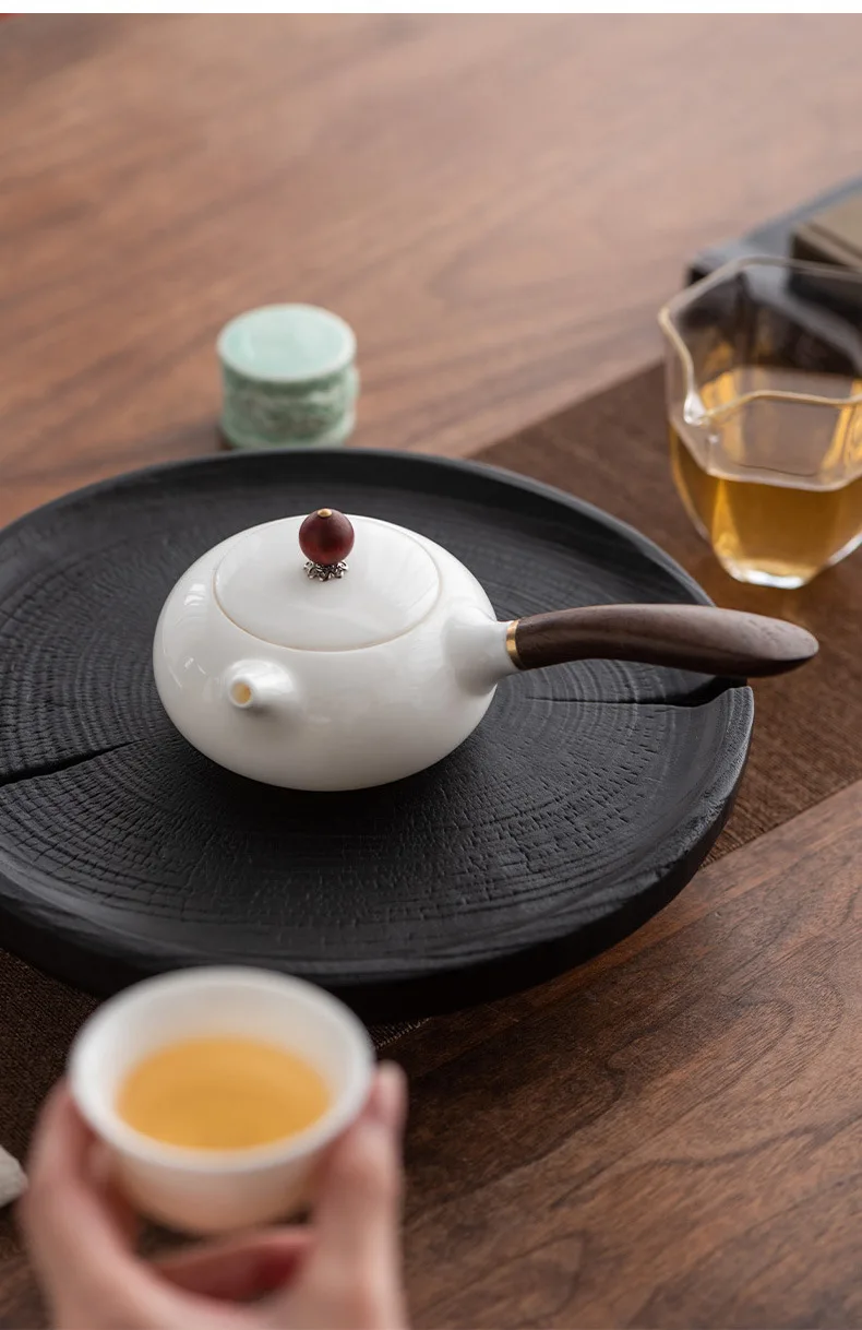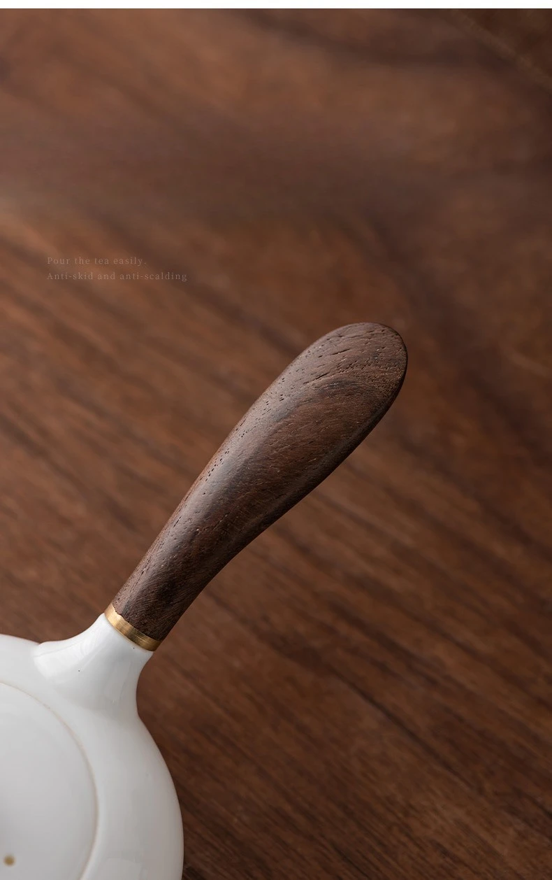 The side handle, crafted from untreated wood, adds a rustic, tactile element to the teapot. It references Japanese kyusu design while maintaining a Chinese aesthetic core.
