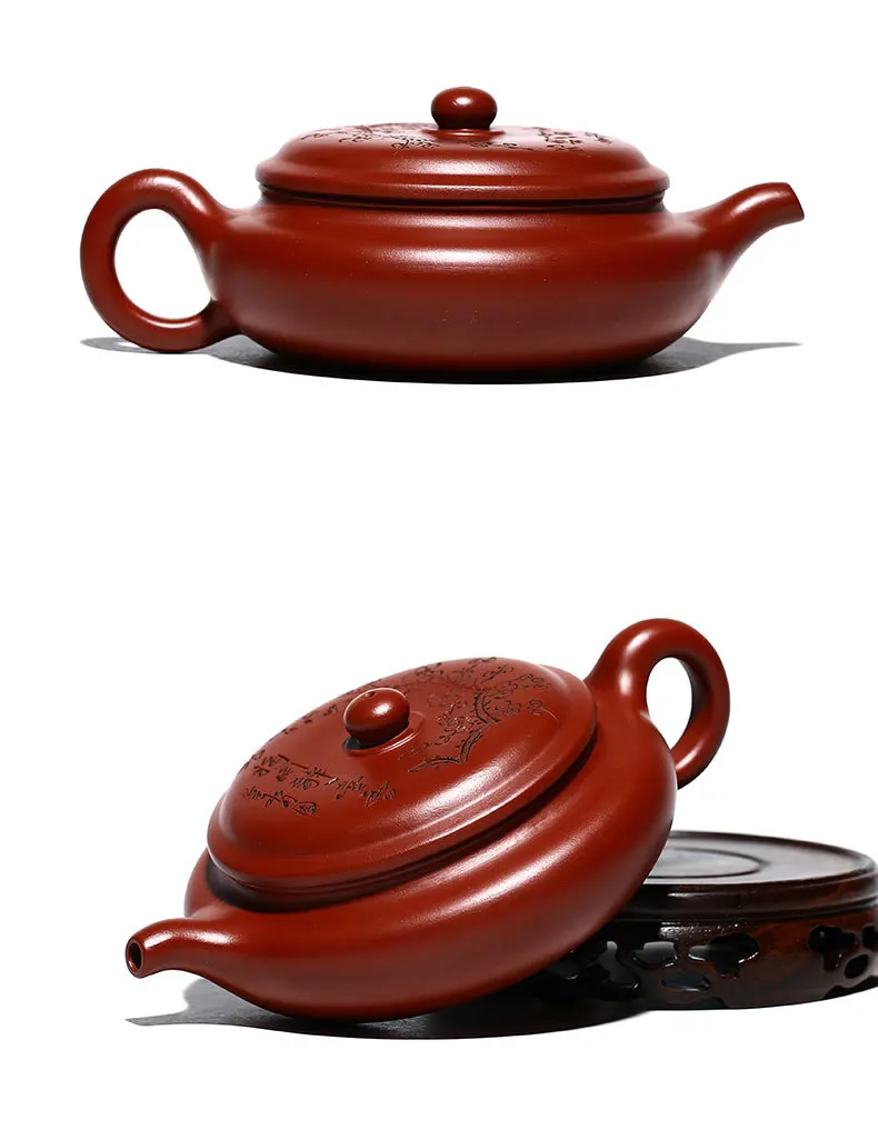 The Plum Whisper 梅影壶 is a 180ml Yixing teapot handcrafted from original ore Da Hong Pao Zisha clay. Its smooth, rounded form is adorned with delicate hand-engraved plum blossoms—symbols of resilience and quiet beauty in Chinese culture. Designed by folk artisans, this teapot blends poetic elegance with practical Gongfu brewing performance, making it a treasured companion for personal tea rituals.