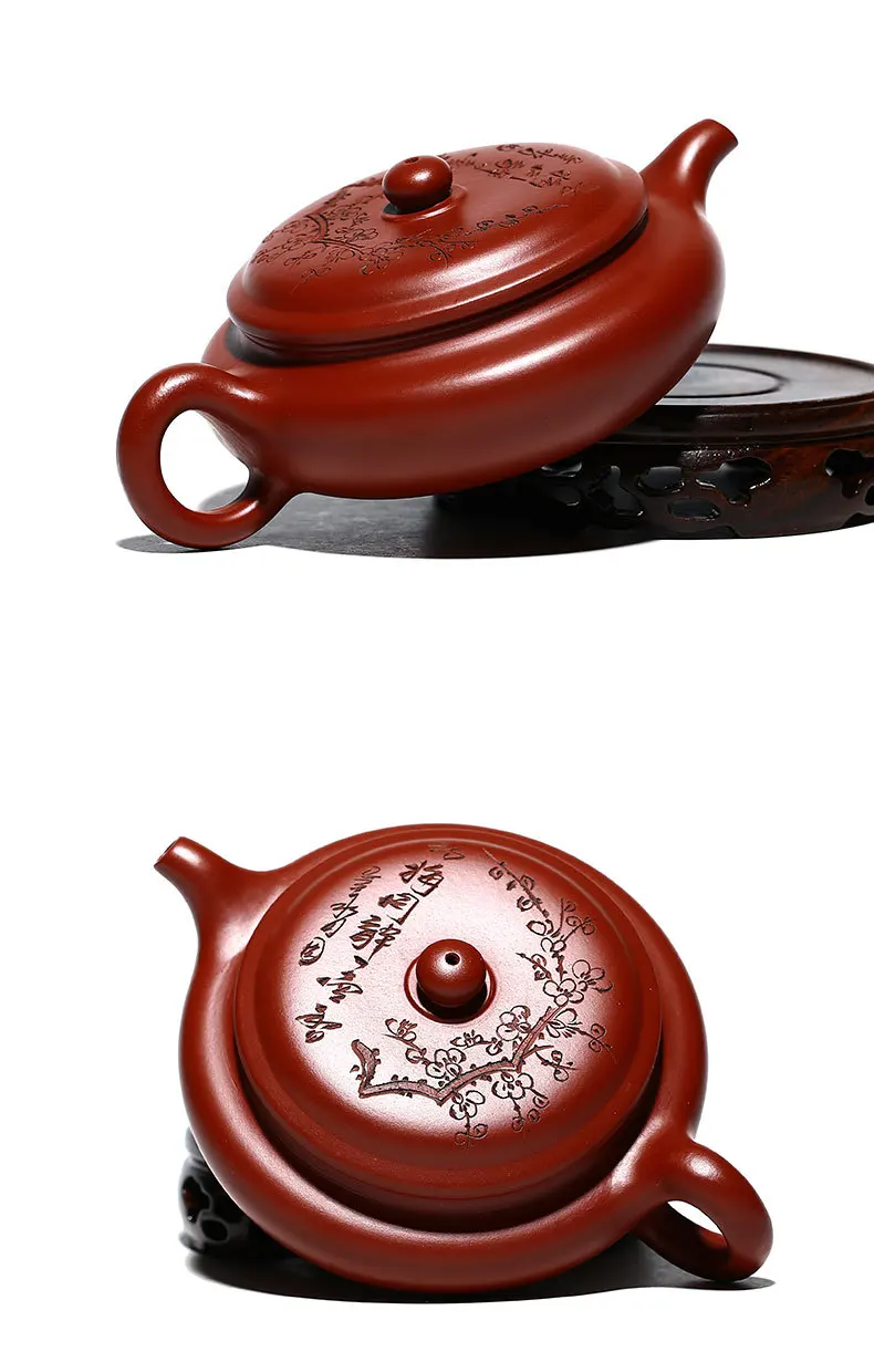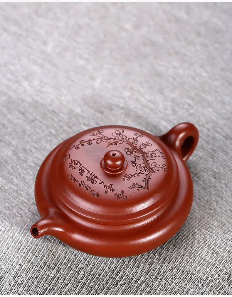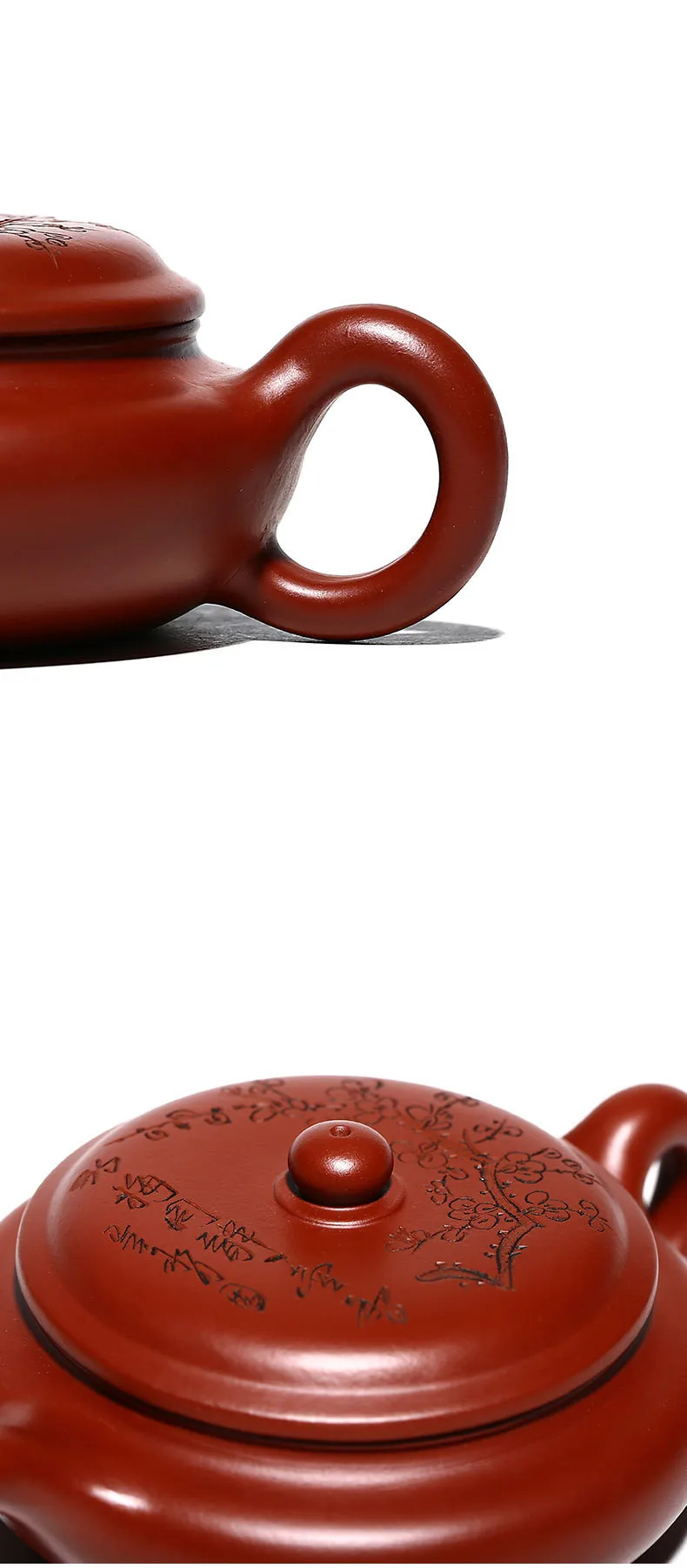 「梅影壶 · Plum Whisper」 — 180ml Handmade Yixing Purple Clay Teapot (Raw Ore Da Hong Pao Clay · Hand-Engraved Plum Blossom Motif · Folk Artisan Work)