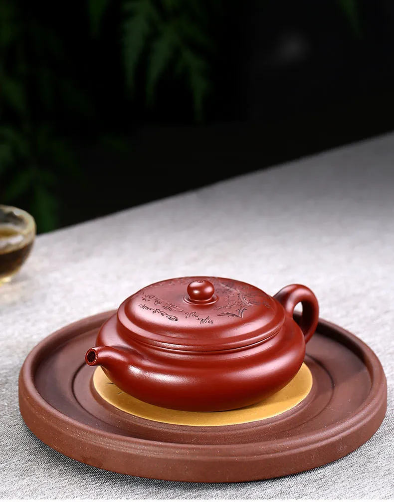 「扁古壶 · Flat Antiquity」 — 230ml Handmade Yixing Purple Clay Teapot (Original Ore Da Hong Pao Clay · Classical Flattened Form · Gongfu Brewing Pot)