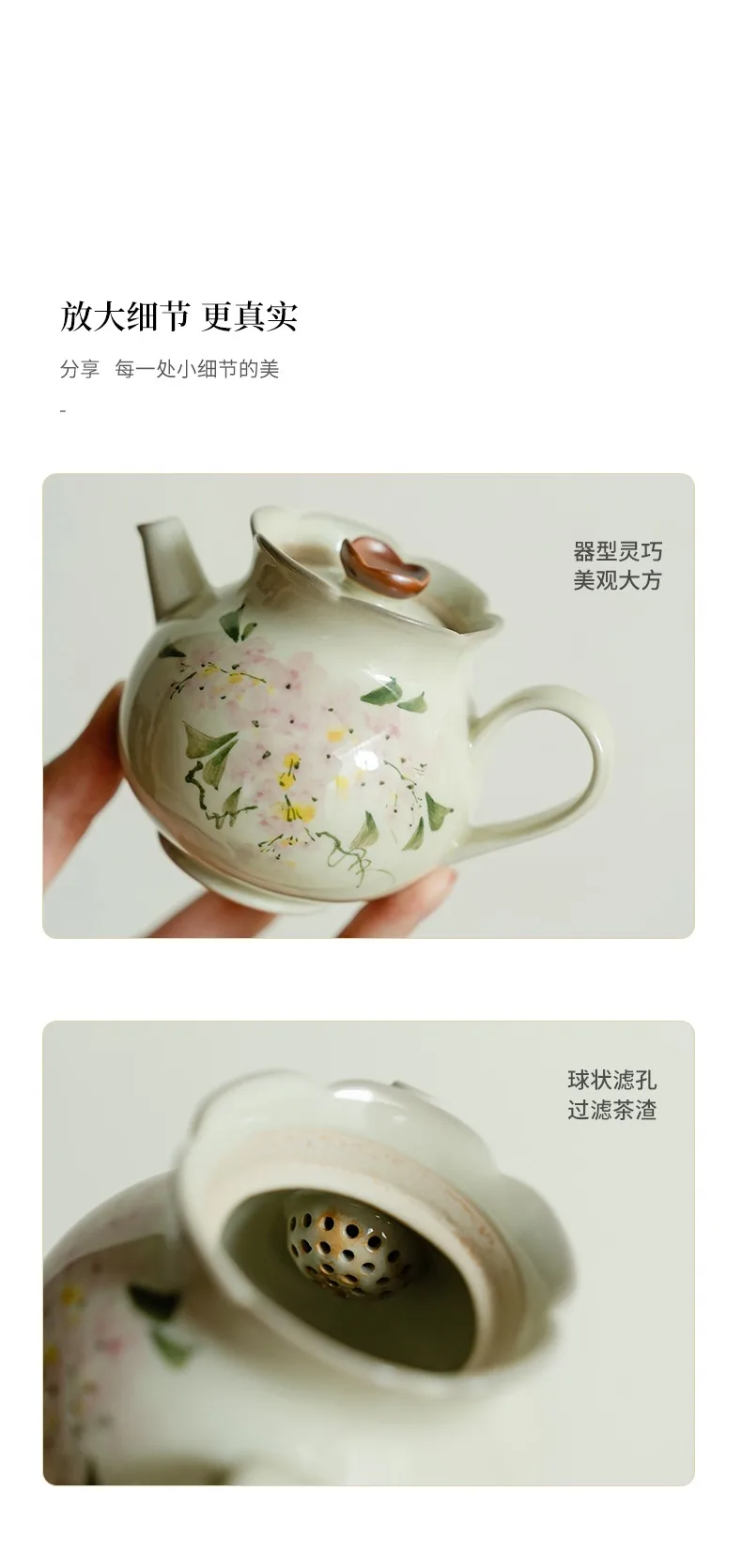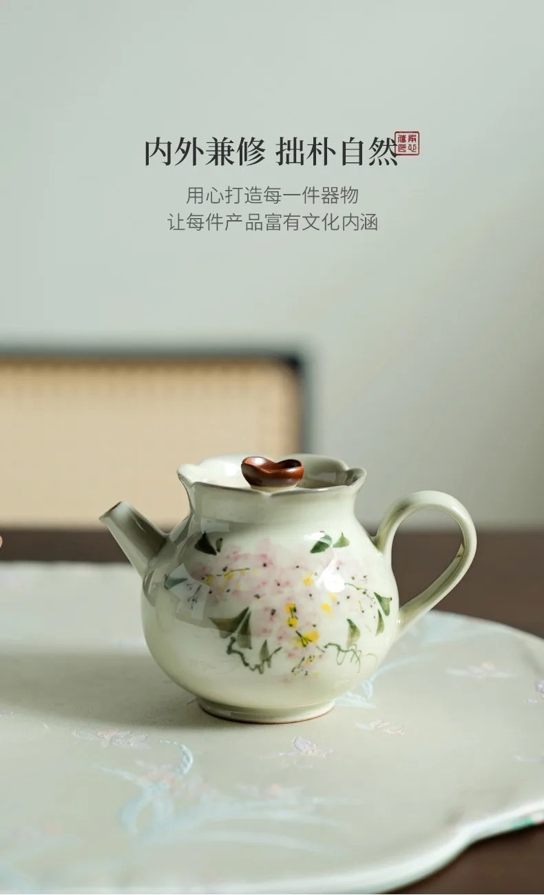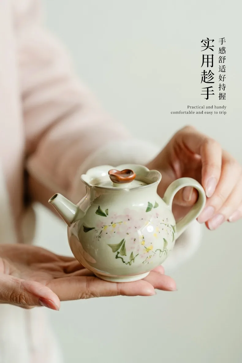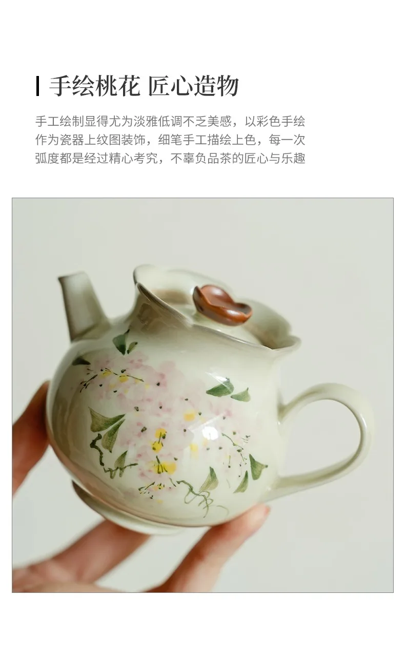 Hand-painted peach blossoms symbolize renewal, love, and the ephemeral nature of life. Their scattered placement across the teapot’s surface mimics petals drifting on spring wind.