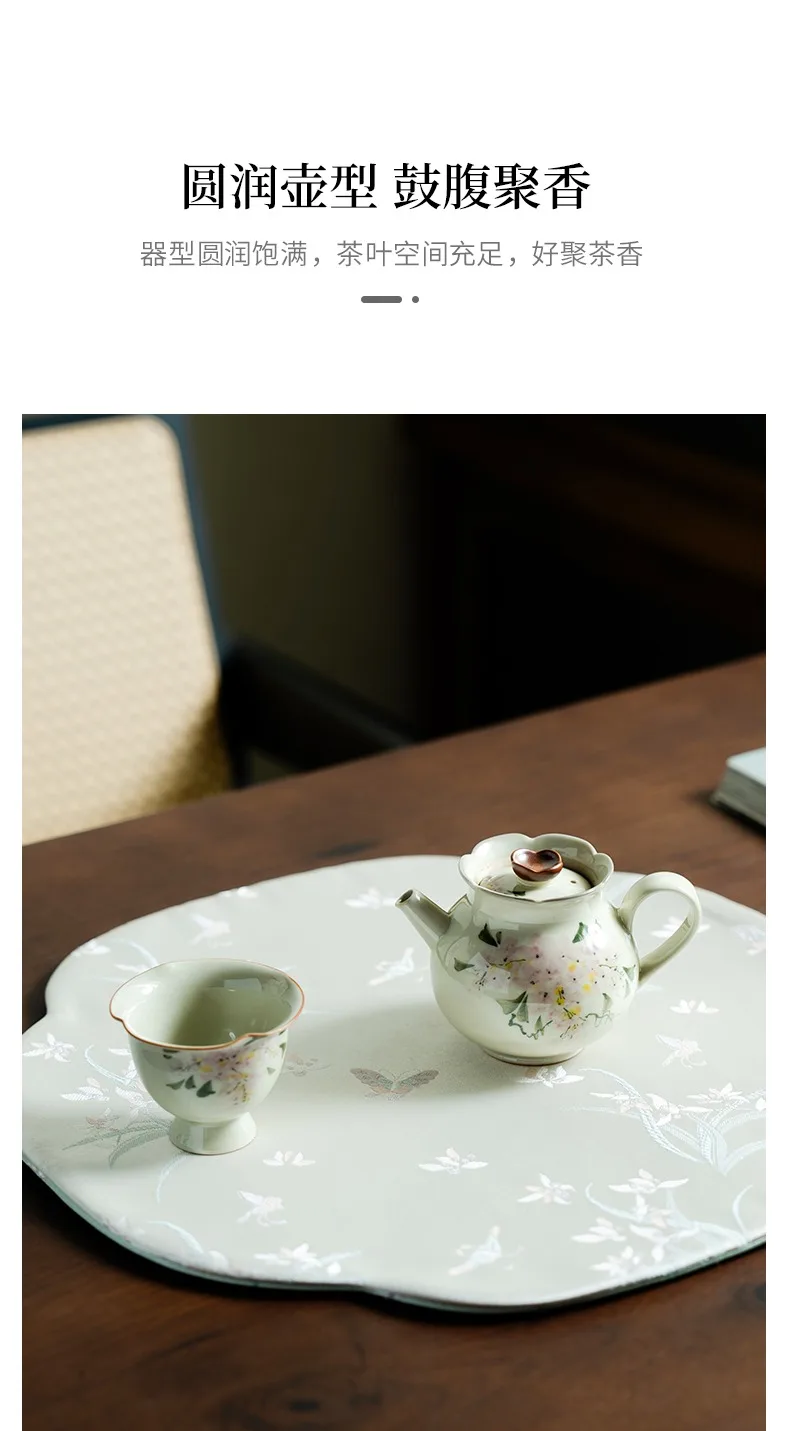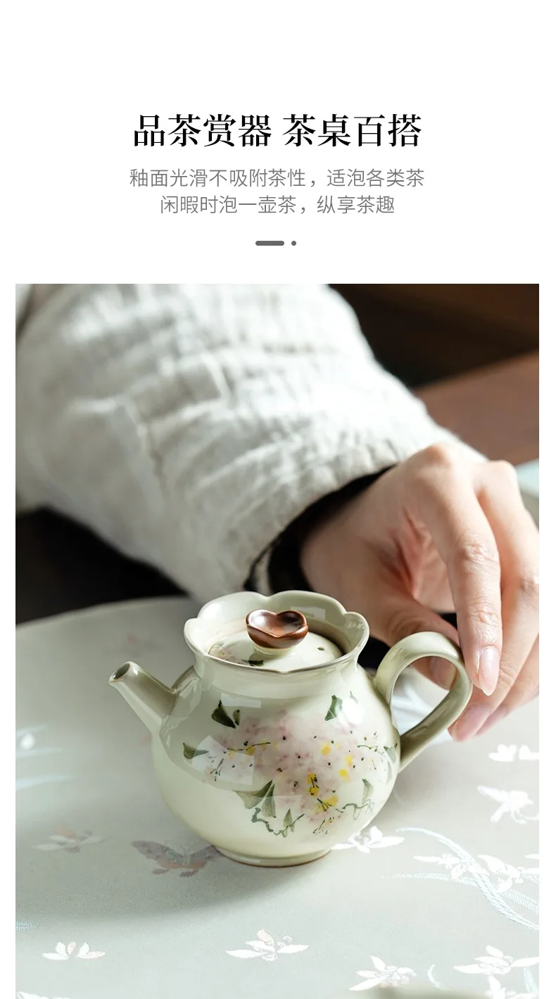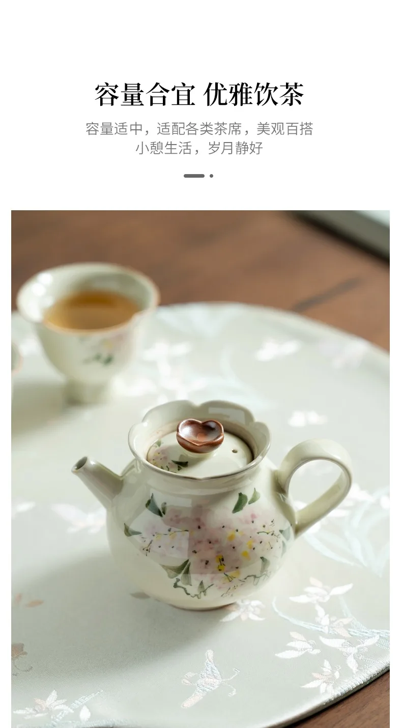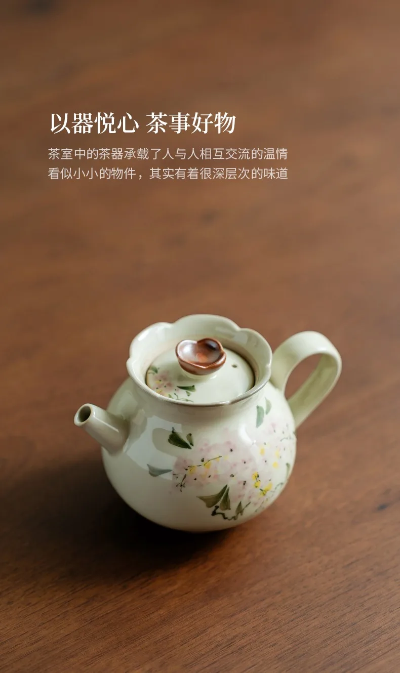 Hand-painted peach blossoms symbolize renewal, love, and the ephemeral nature of life. Their scattered placement across the teapot’s surface mimics petals drifting on spring wind.
