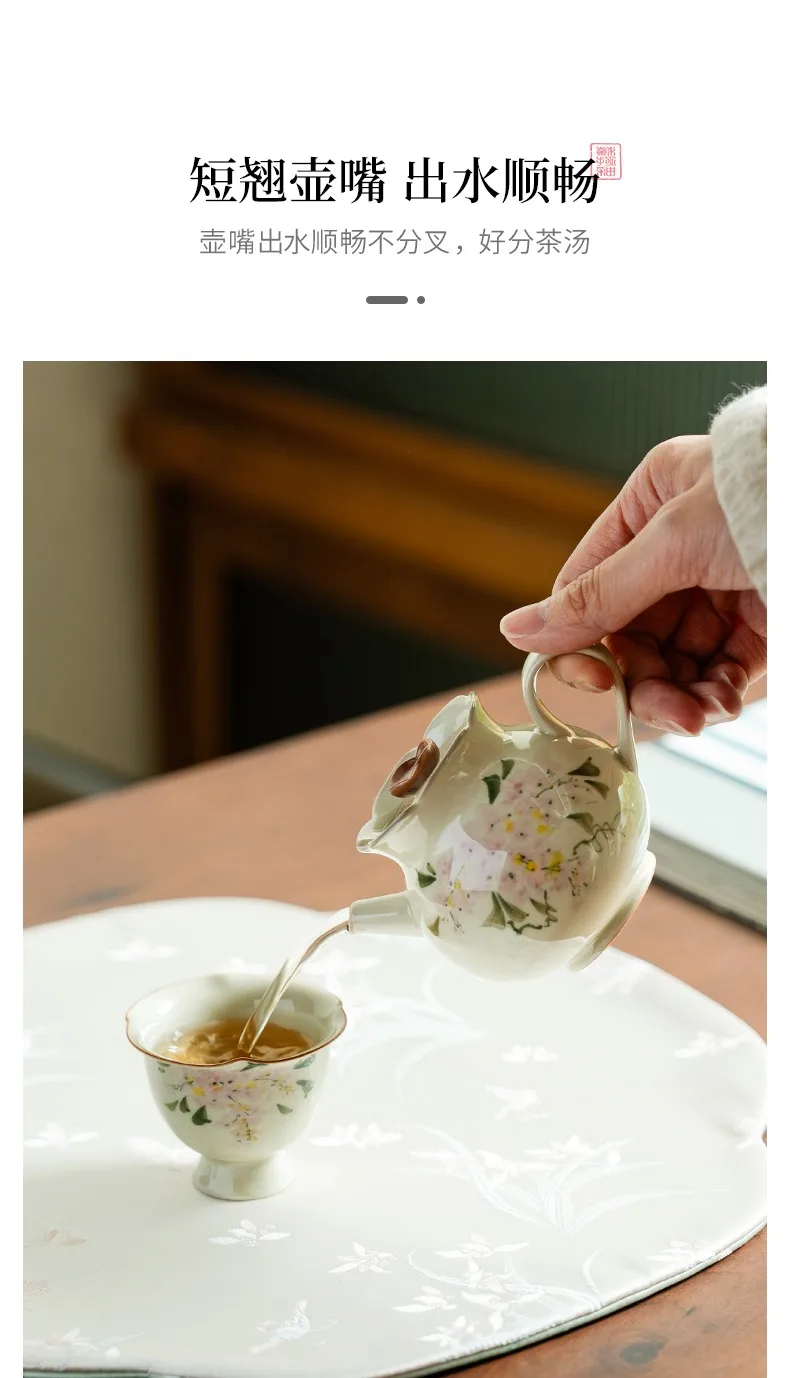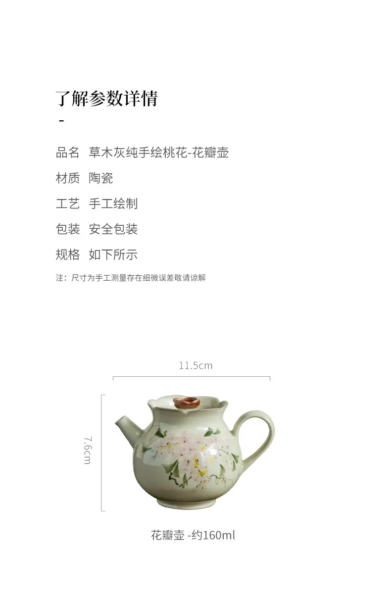 The Petal Ash 灰影桃花壶 is a 90ml handmade ceramic teapot finished with a natural grass-ash glaze and adorned with delicate, hand-painted peach blossom petals. With its compact size and poetic design, this teapot is ideal for solo Gongfu tea sessions, seasonal rituals, or as a collectible piece of functional art.