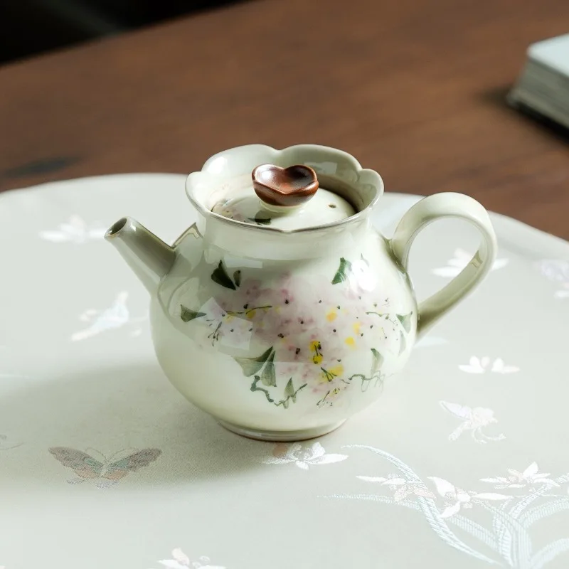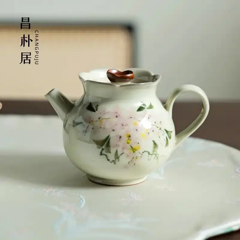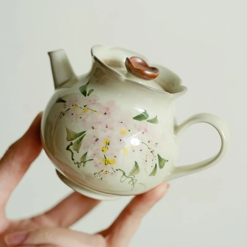 Hand-painted peach blossoms symbolize renewal, love, and the ephemeral nature of life. Their scattered placement across the teapot’s surface mimics petals drifting on spring wind.