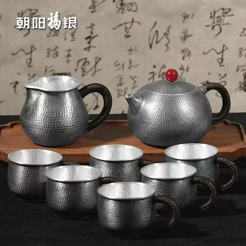 「雅聚银礼 · Gilt Ya Ju Set」 — 999 Sterling Silver Tea Set (Gilded Accents · Japanese Style · Kettle + Fair Cup + Cups · Gift Box Presentation)