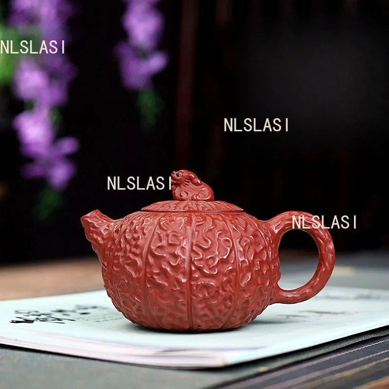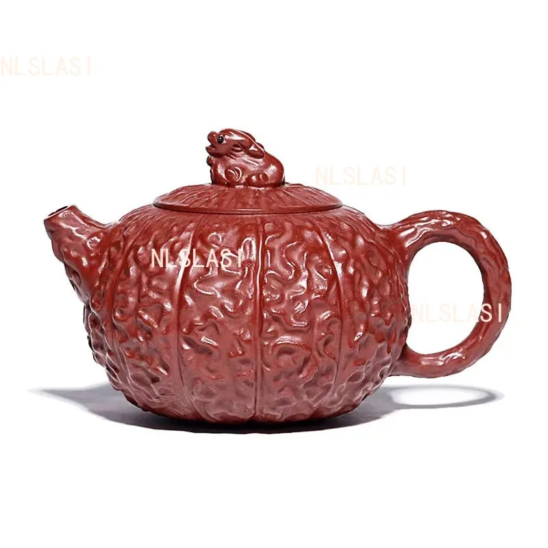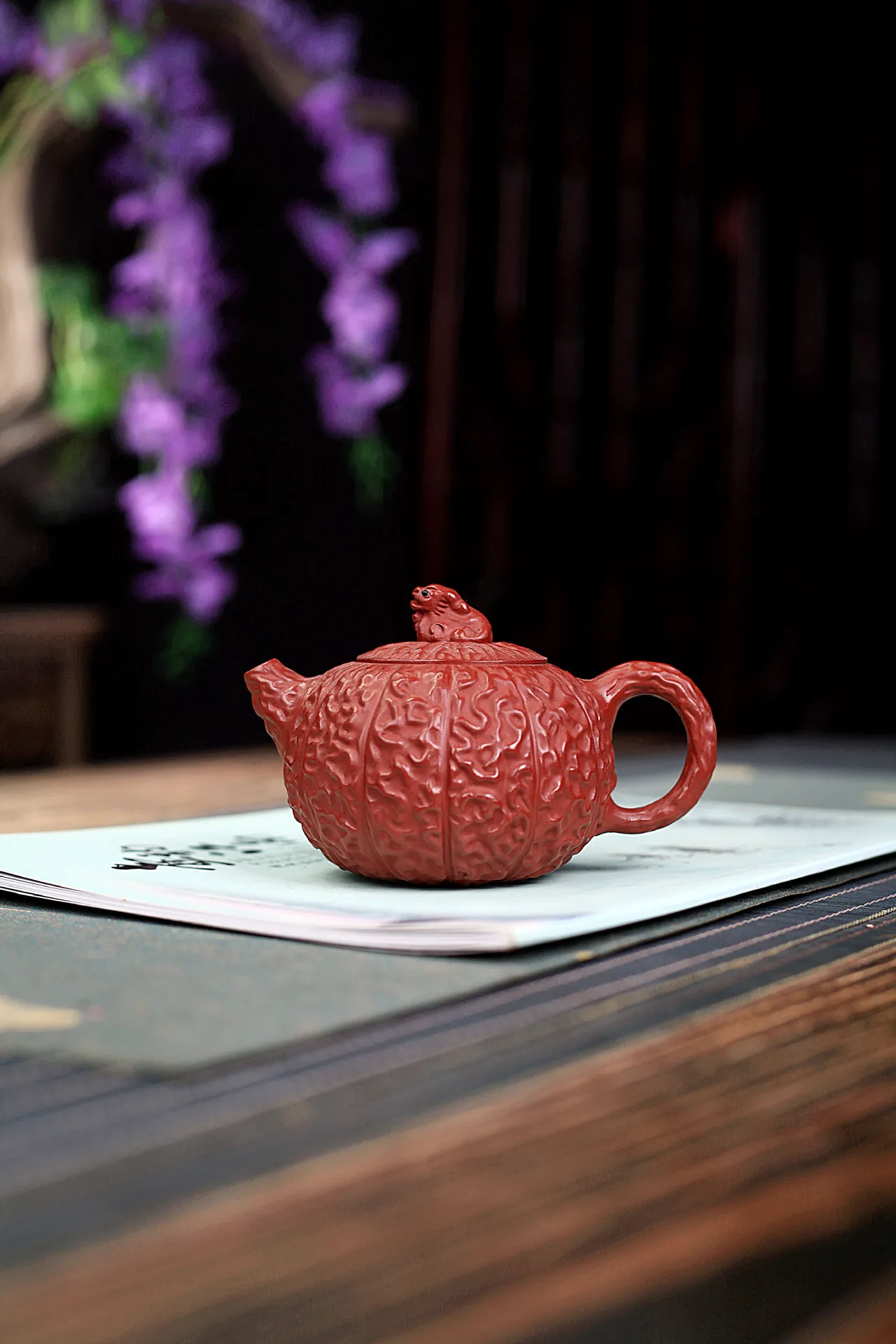 Design Highlight: The teapot’s body is carved with deep, flowing grooves that evoke the natural folds of a Bodhi seed or ancient gourd, while the lid features a sculpted creature—possibly a frog or toad—symbolizing transformation and harmony with nature.