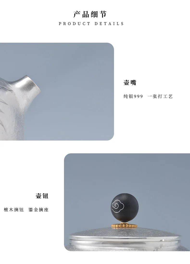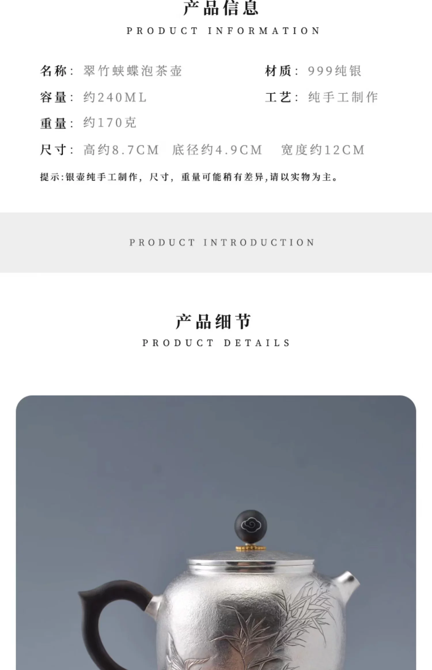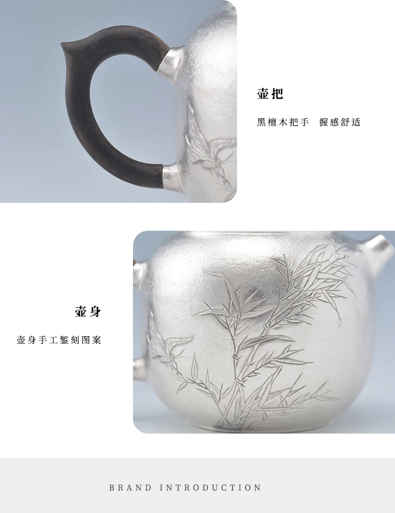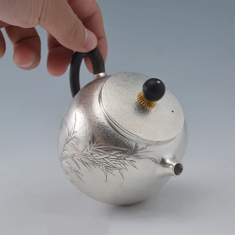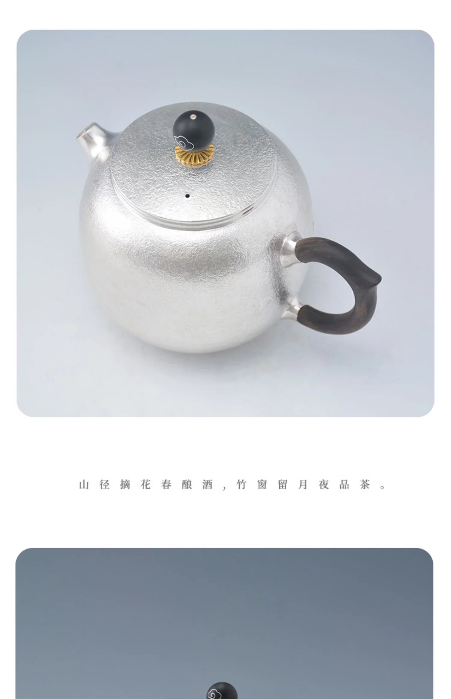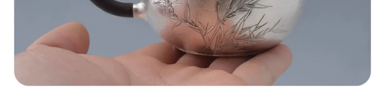 The Bamboo Whisper 竹影壶 is a 220ml handcrafted teapot made from 999 sterling silver, featuring a textured surface with engraved bamboo stalks and leaves. The black handle and matching lid knob, accented with a white swirl and golden collar, create a striking contrast against the silver body. This teapot embodies the quiet strength and elegance of bamboo, making it ideal for Gongfu tea rituals or as a refined collector’s piece.