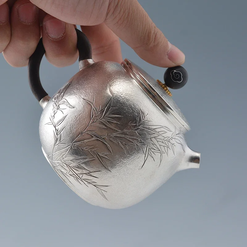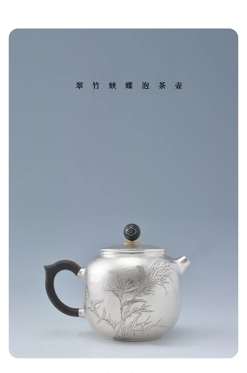 「竹影壶 · Bamboo Whisper」 — 220ml Handmade 999 Sterling Silver Teapot (Engraved Bamboo Motif · Textured Body · Black Handle & Swirl Lid)