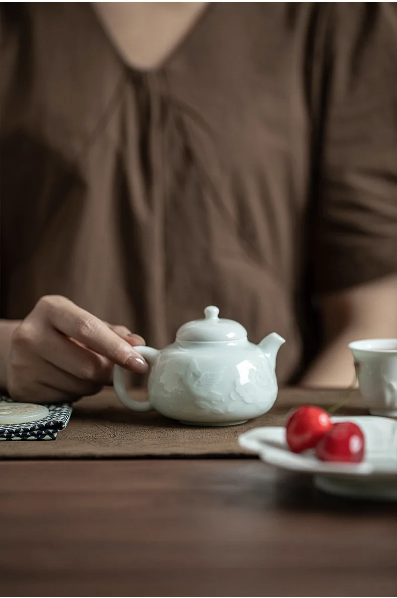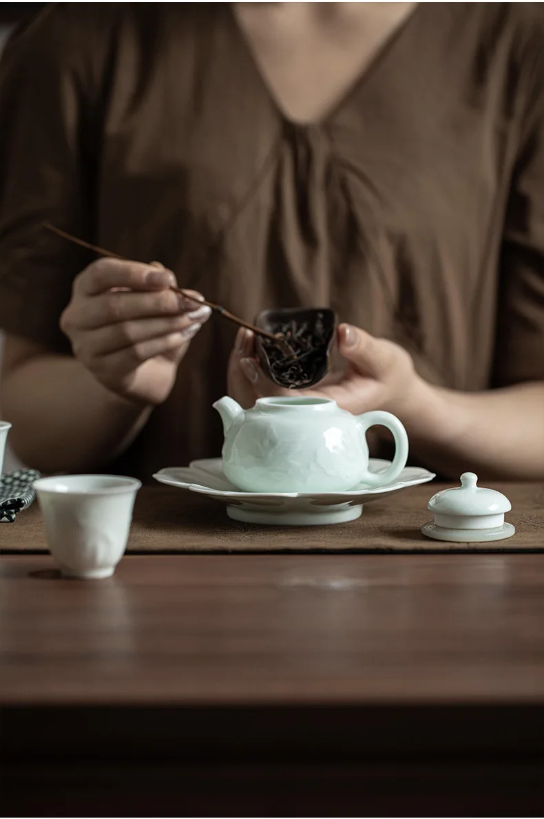 The Blossom Spring 花供春影青壶 is a 180ml porcelain teapot crafted in the traditional Gongchun form, finished with a soft Yingqing glaze and adorned with delicate floral embossing. Inspired by Song dynasty aesthetics and literati tea culture, this teapot features a built-in ceramic ball mesh filter, making it ideal for Gongfu-style brewing at home. The pale celadon hue and sculptural relief evoke a sense of quiet refinement and seasonal renewal.