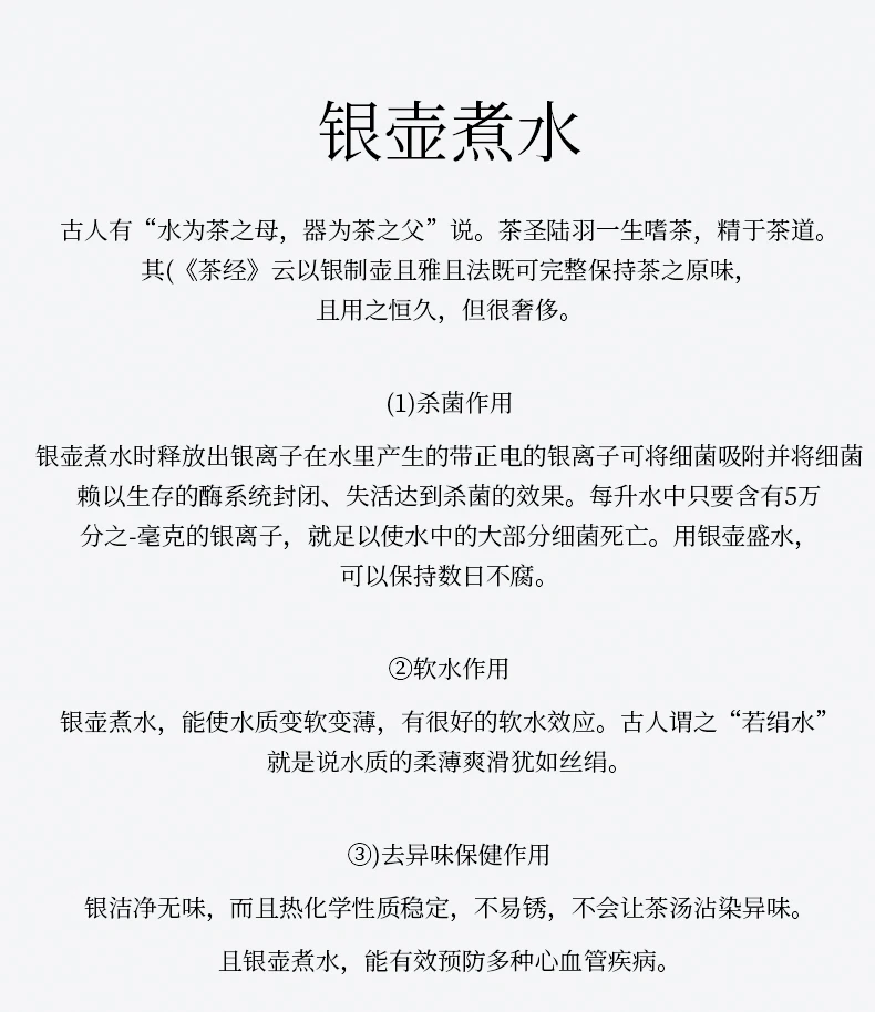 Silver is prized for its antibacterial properties, ability to soften water, and enhance the clarity of tea. It is also believed to support cardiovascular health and promote longevity.