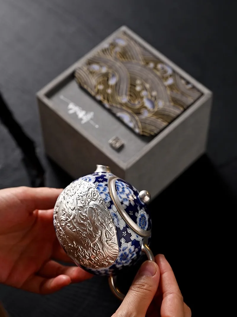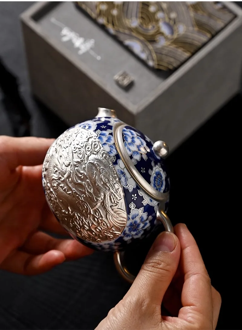 Design Highlight: The porcelain body is adorned with cobalt floral patterns, partially veiled by a sculptural silver overlay of a soaring phoenix and coiling dragon. The lid mirrors the porcelain-silver harmony and is topped with a polished silver finial.