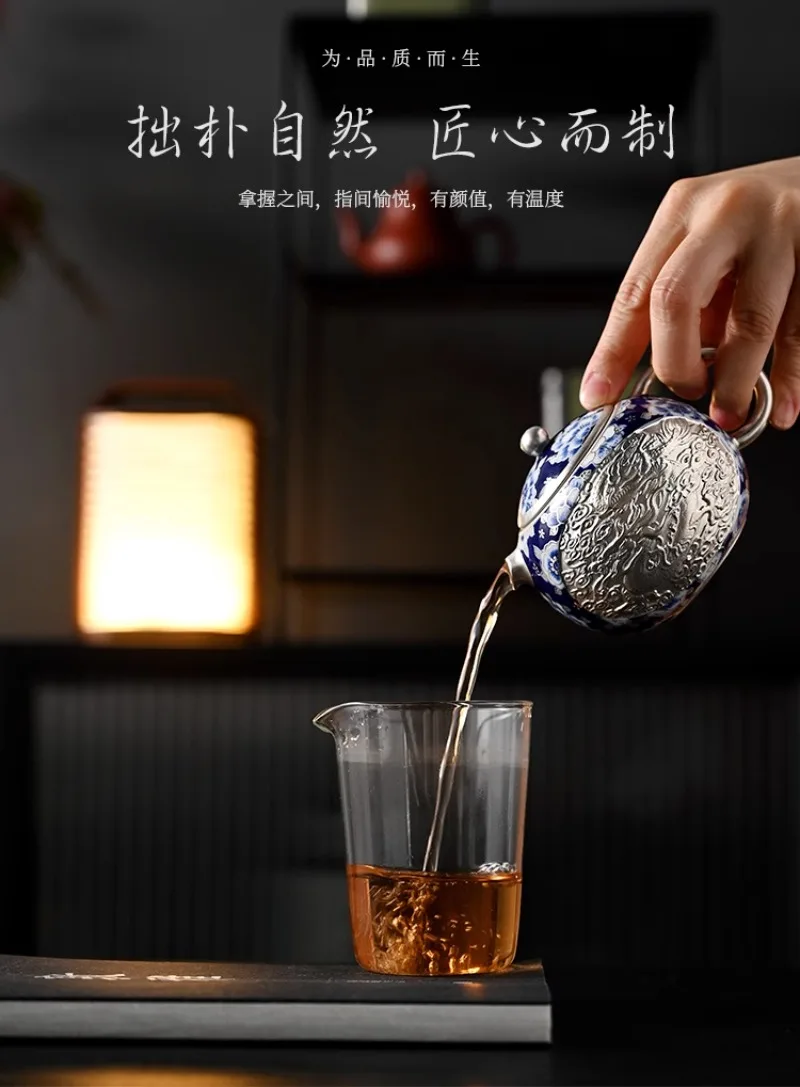 The Celestial Harmony 西式龙凤壶 is a 300ml artisan teapot that fuses traditional blue-and-white porcelain with a hand-embossed sterling silver overlay. Featuring a dragon and phoenix in dynamic relief, this teapot embodies the union of yin and yang, heaven and earth, and East-West aesthetics. The porcelain base offers a classic floral motif, while the silverwork adds depth, symbolism, and ceremonial grandeur.