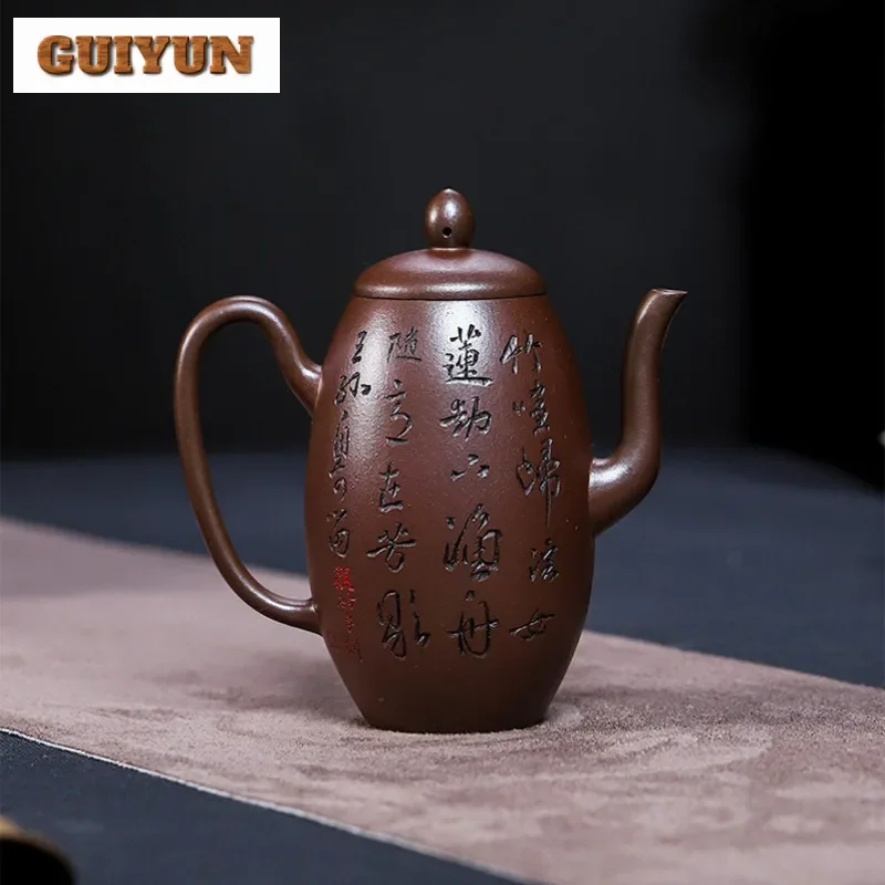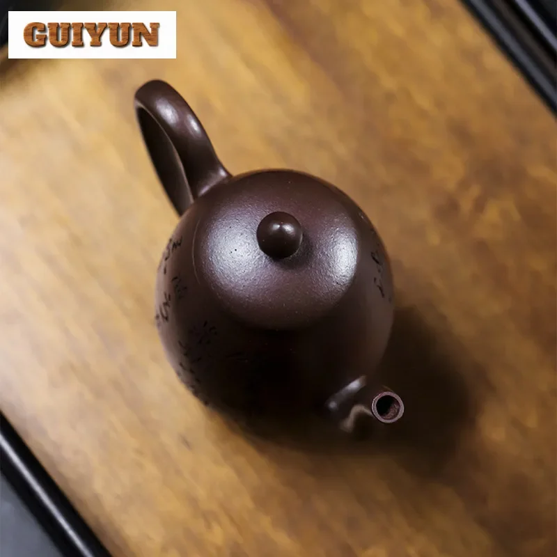 「金砂铭壶 · Golden Verse」 — 200ml Handmade Yixing Purple Clay Teapot (Raw Ore Gold Sand Purple Mud · Calligraphy Engraving · Gold Bead Form)