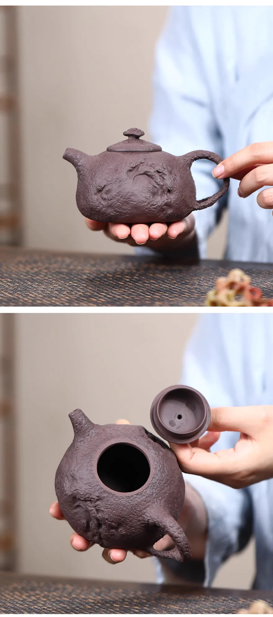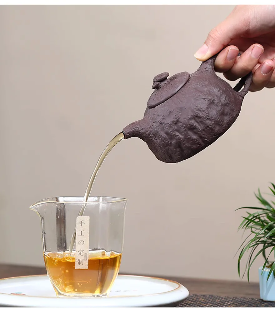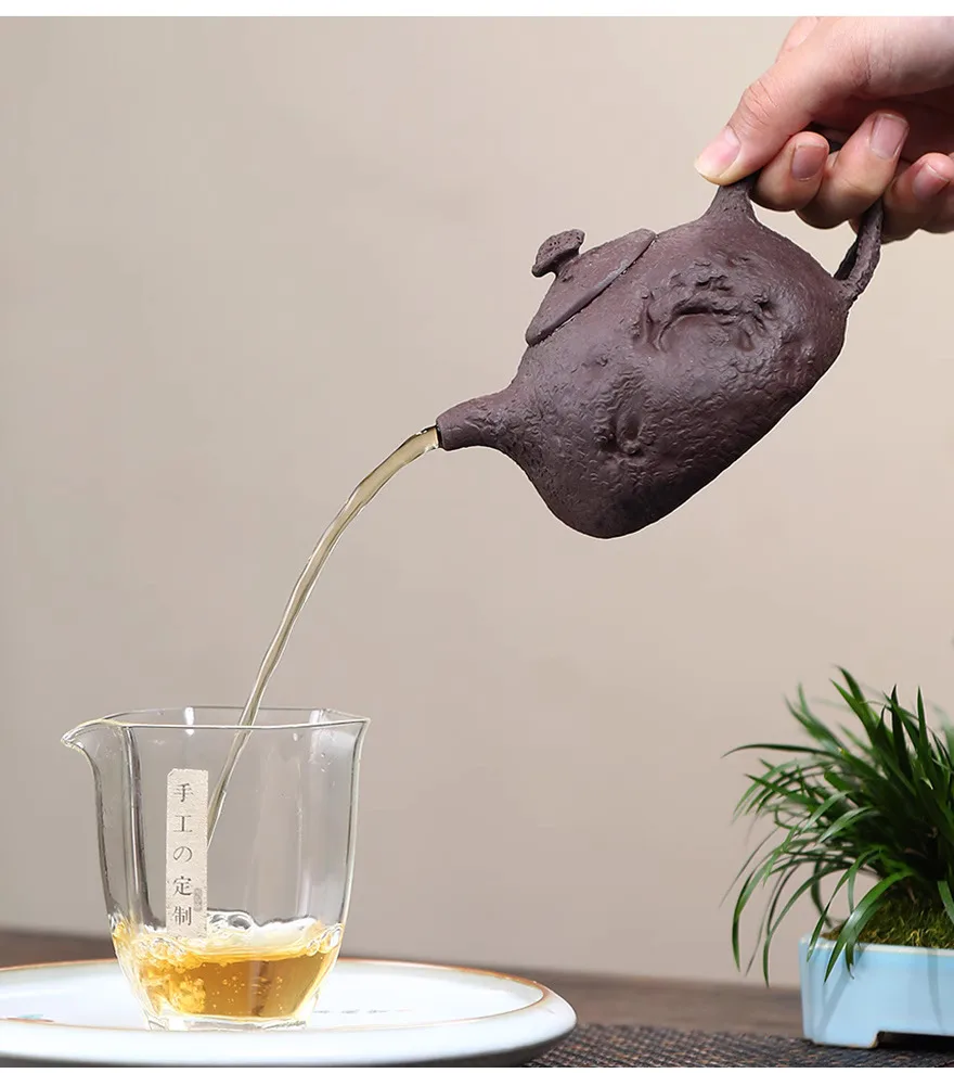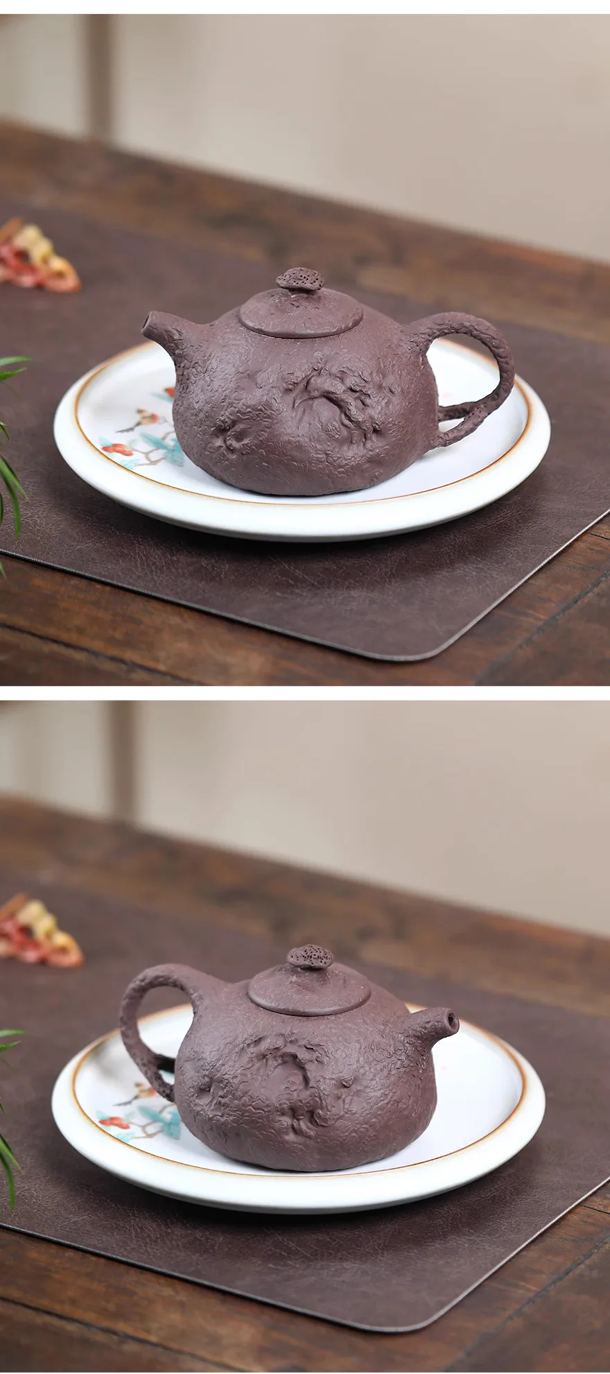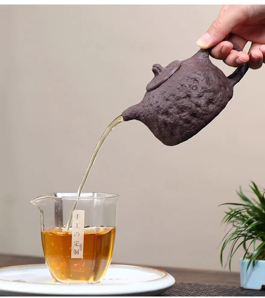 The Hidden Spring 隐泉壶 is a 1.0L Yixing teapot crafted from original mine purple clay sourced from the revered Huanglongshan region. With a bold, textured surface and a rounded, grounded form, this semi-handmade teapot embodies the quiet strength of spring water flowing beneath stone. Its generous capacity and sculptural presence make it ideal for tea gatherings, ceremonial use, or as a collector’s centerpiece.