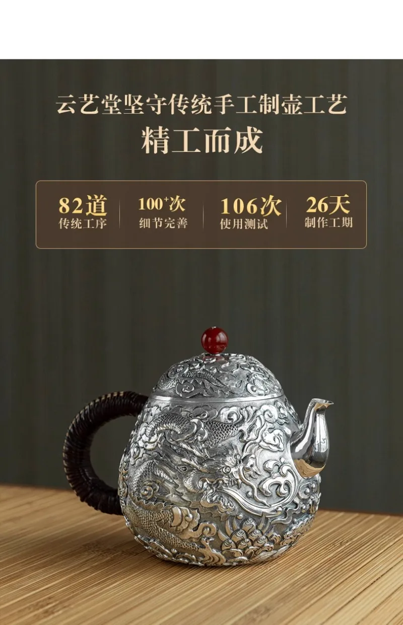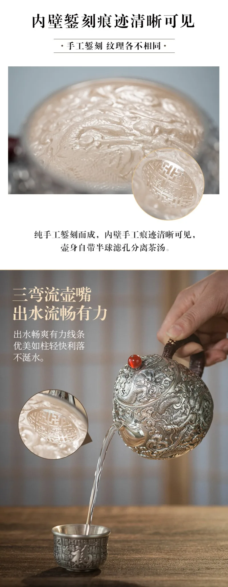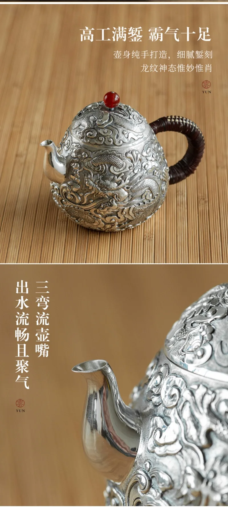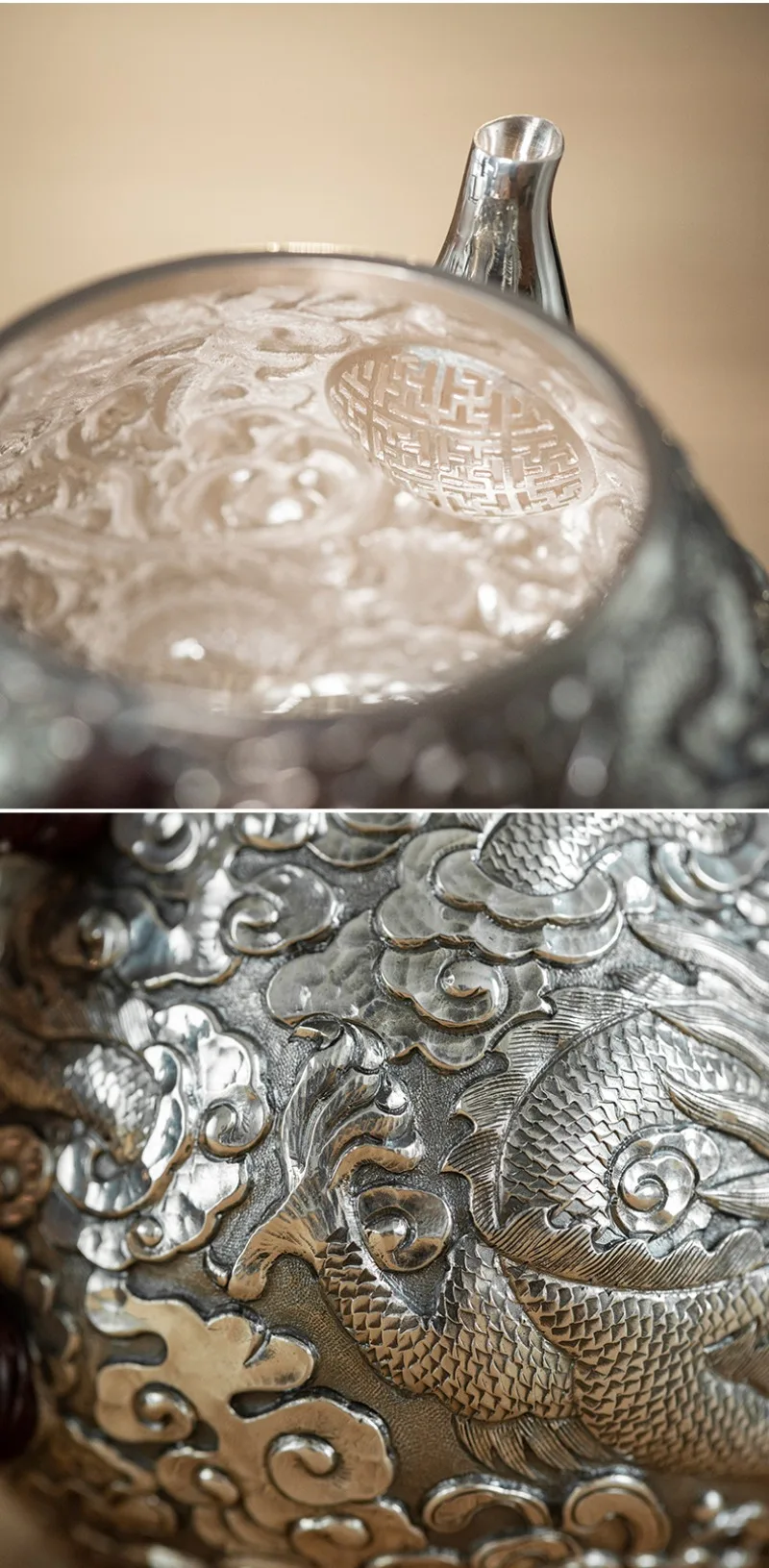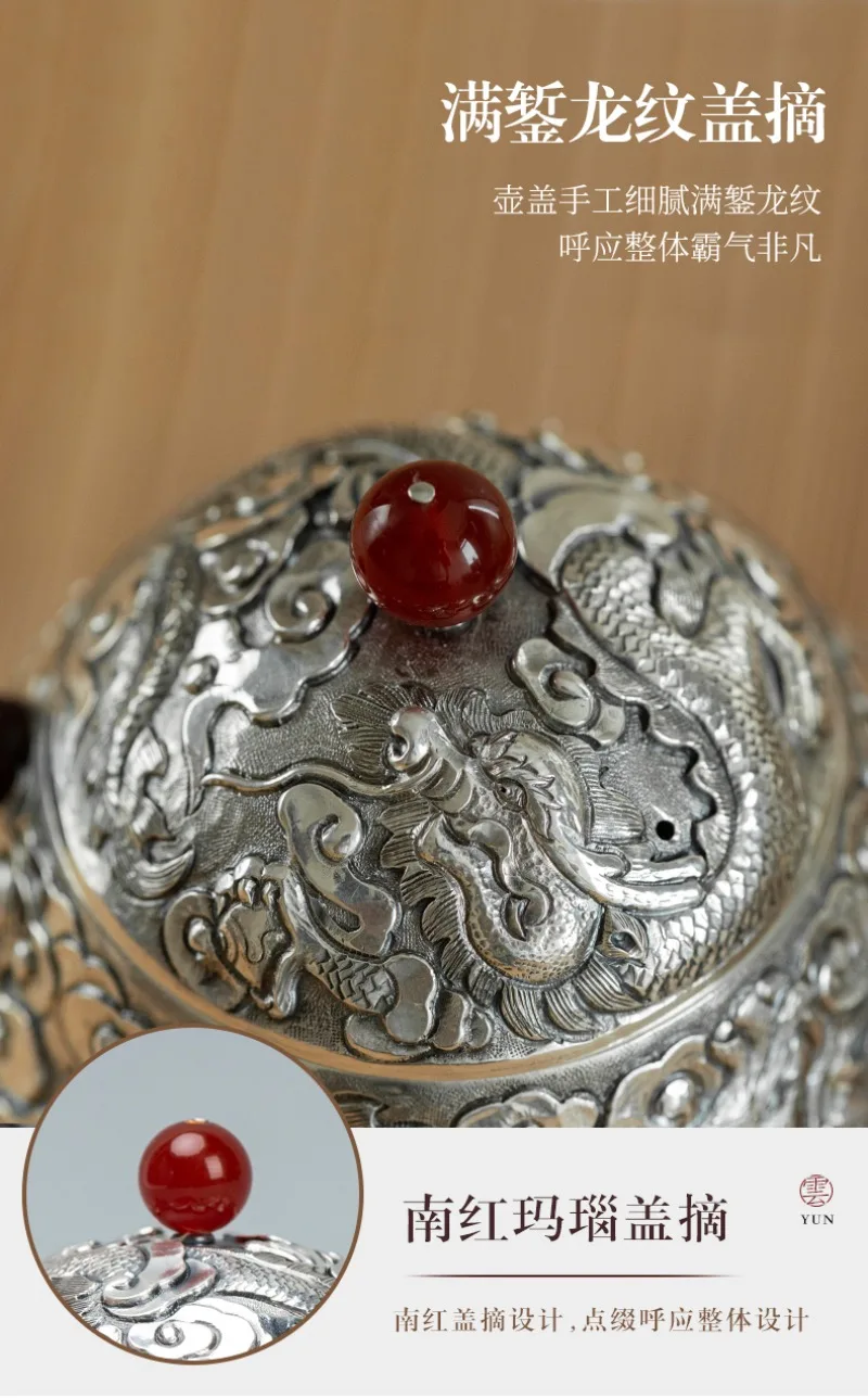 The Dragon Egg 龙蛋壶 is a 350ml handcrafted teapot forged from 99.9% pure silver, featuring a double dragon motif in high-relief carving. Designed for both boiling and brewing, this teapot combines ceremonial grandeur with functional excellence. Its egg-shaped body, wrapped in swirling clouds and twin dragons, symbolizes rebirth, power, and cosmic balance.