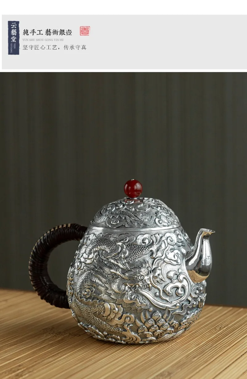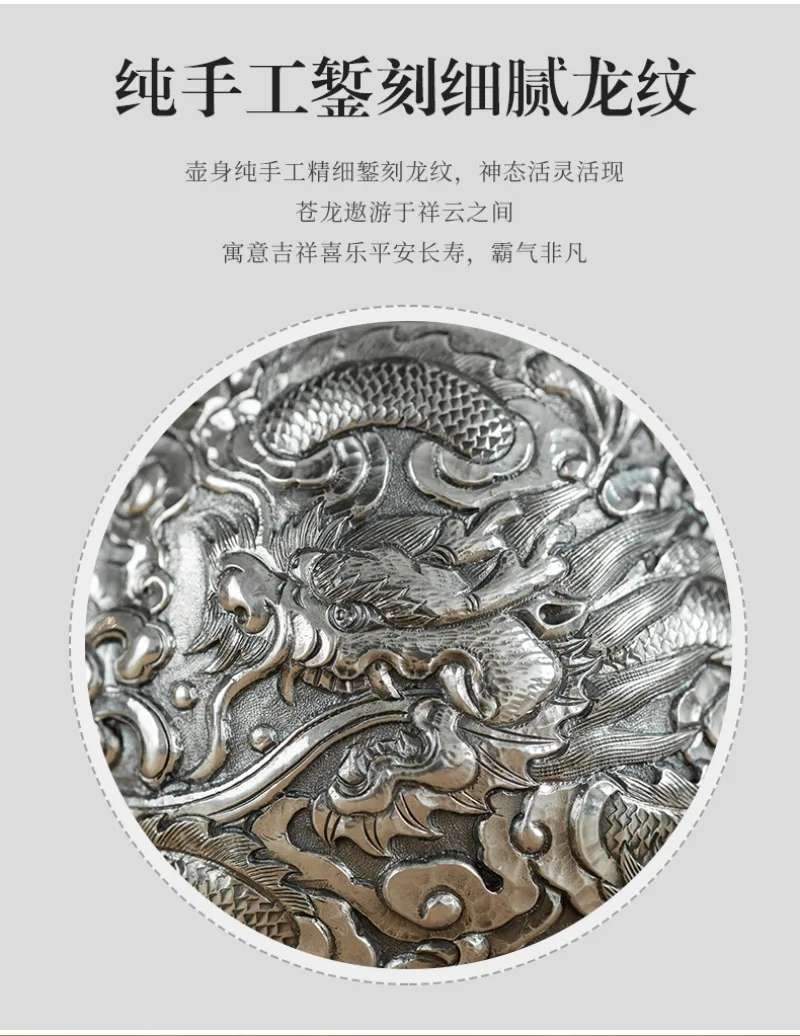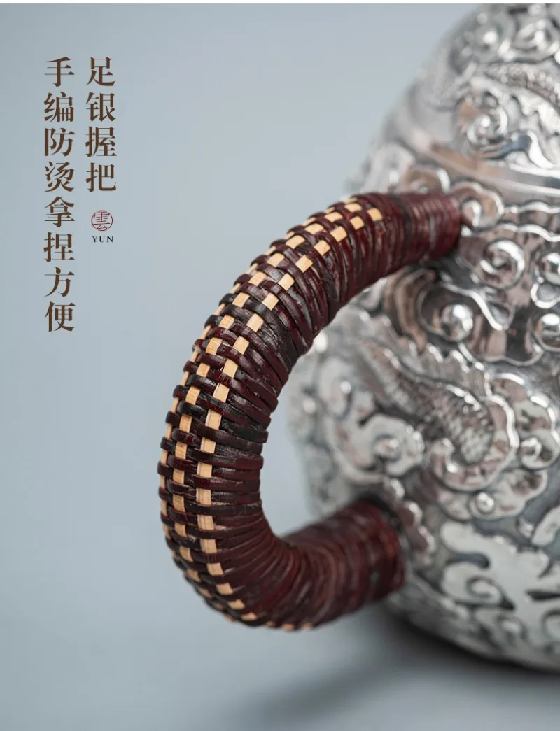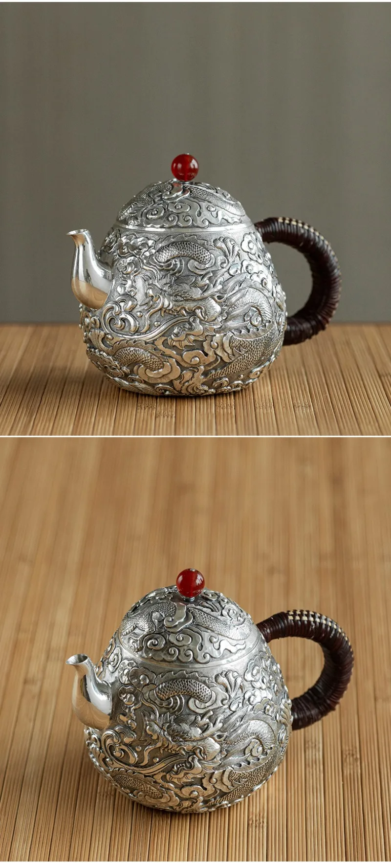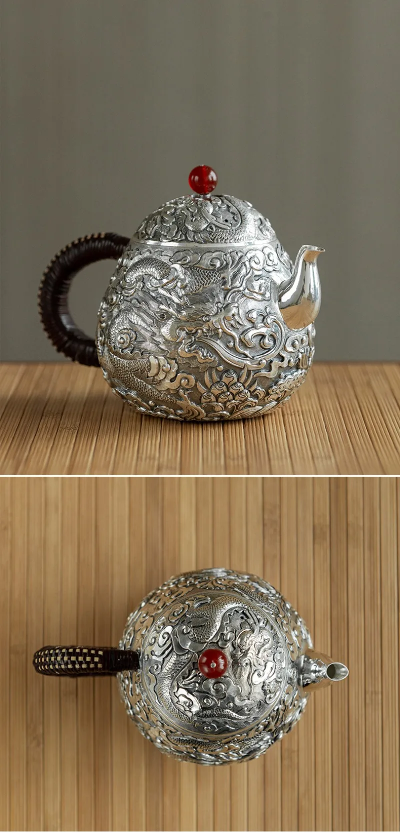 The Dragon Egg 龙蛋壶 is a 350ml handcrafted teapot forged from 99.9% pure silver, featuring a double dragon motif in high-relief carving. Designed for both boiling and brewing, this teapot combines ceremonial grandeur with functional excellence. Its egg-shaped body, wrapped in swirling clouds and twin dragons, symbolizes rebirth, power, and cosmic balance.