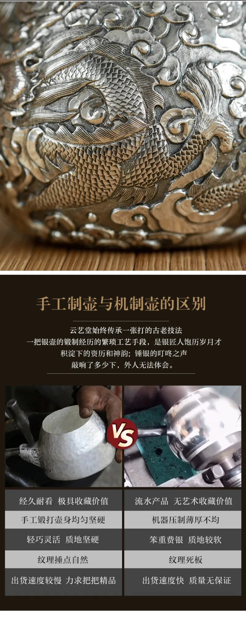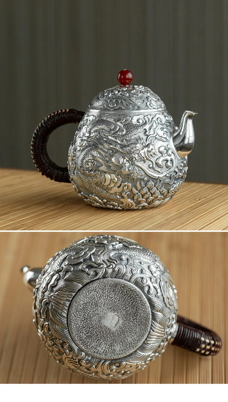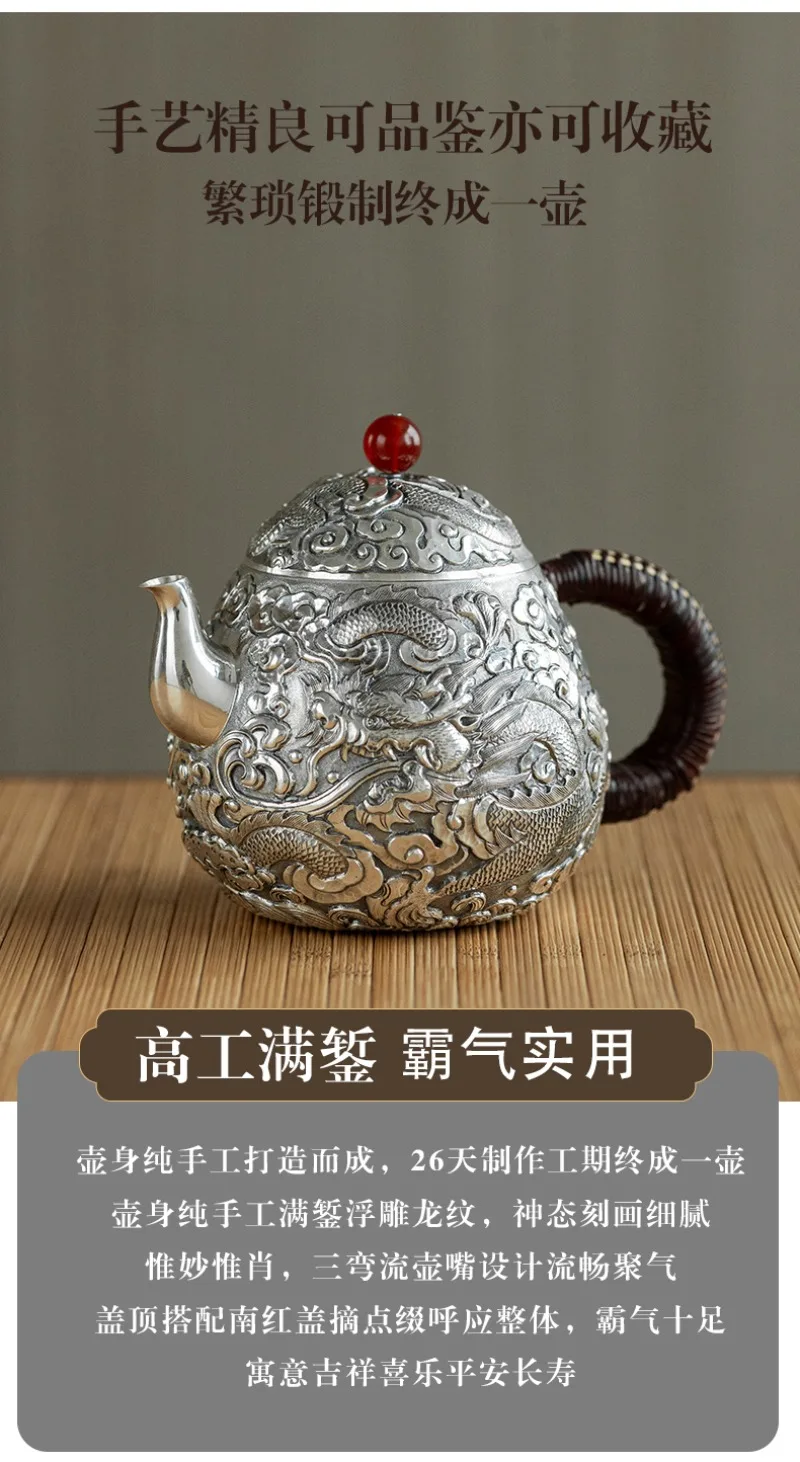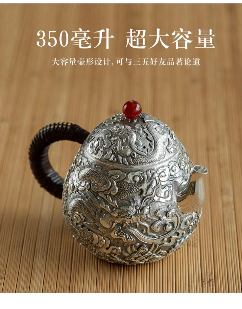 「龙蛋壶 · Dragon Egg」 — 350ml Hand-Carved 999 Pure Silver Teapot (Double Dragon Relief · Boiling & Brewing · Large Capacity)