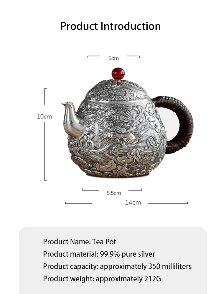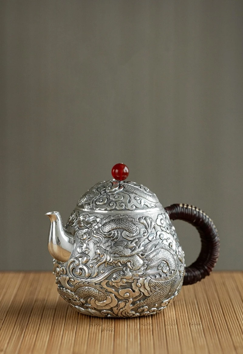 The Dragon Egg 龙蛋壶 is a 350ml handcrafted teapot forged from 99.9% pure silver, featuring a double dragon motif in high-relief carving. Designed for both boiling and brewing, this teapot combines ceremonial grandeur with functional excellence. Its egg-shaped body, wrapped in swirling clouds and twin dragons, symbolizes rebirth, power, and cosmic balance.