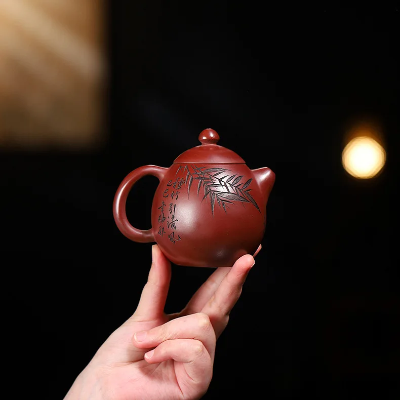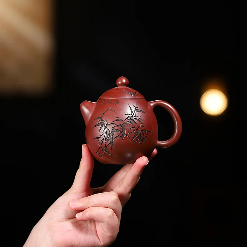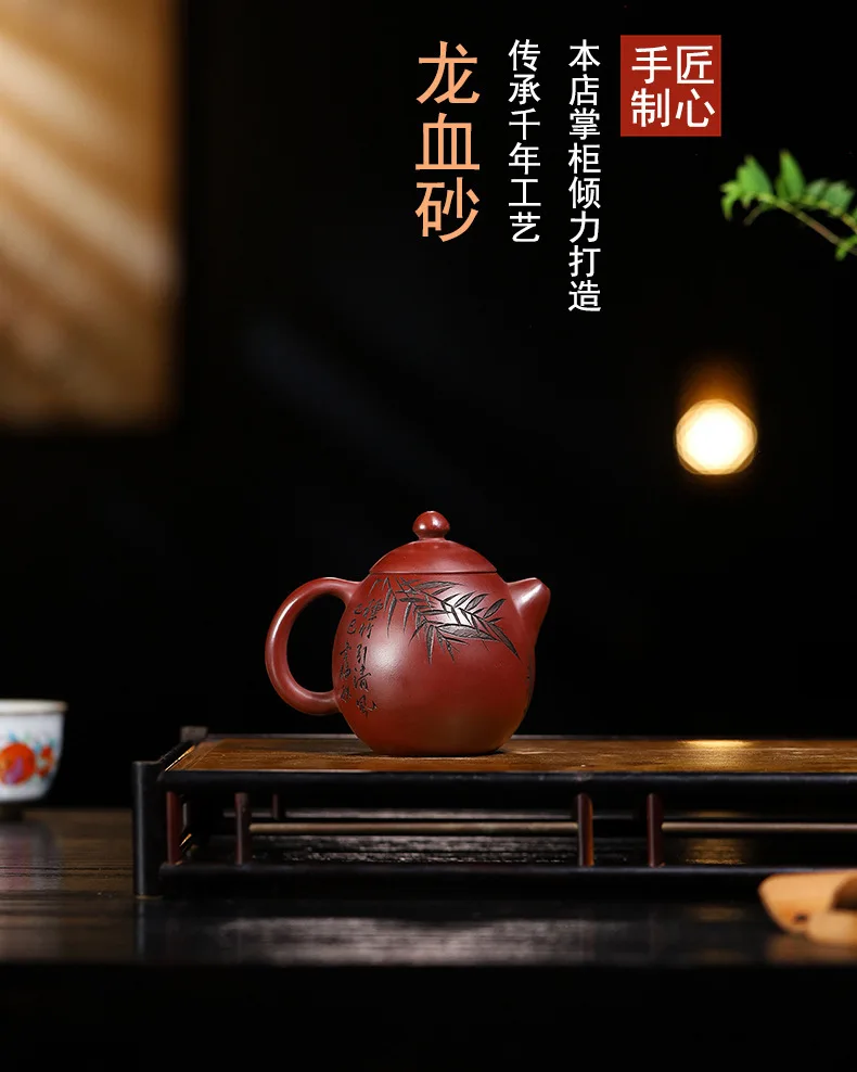 The Crimson Egg 龙血龙蛋壶 is a 210ml Gongfu teapot crafted from raw ore Dragon Blood Sand clay (龙血砂), a rare and richly pigmented Yixing material. Shaped in the iconic dragon egg form and adorned with hand-engraved bamboo leaves and flowing calligraphy, this teapot embodies the harmony of strength and serenity.