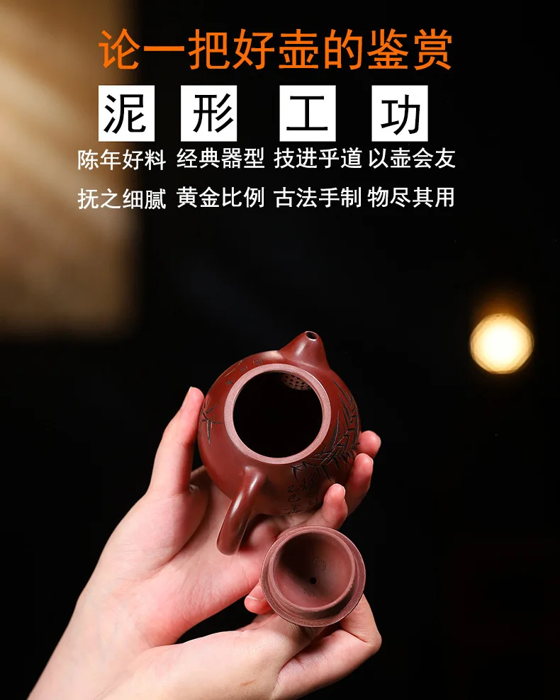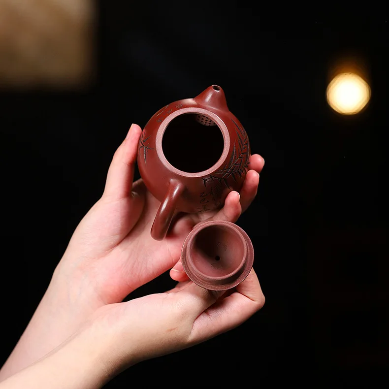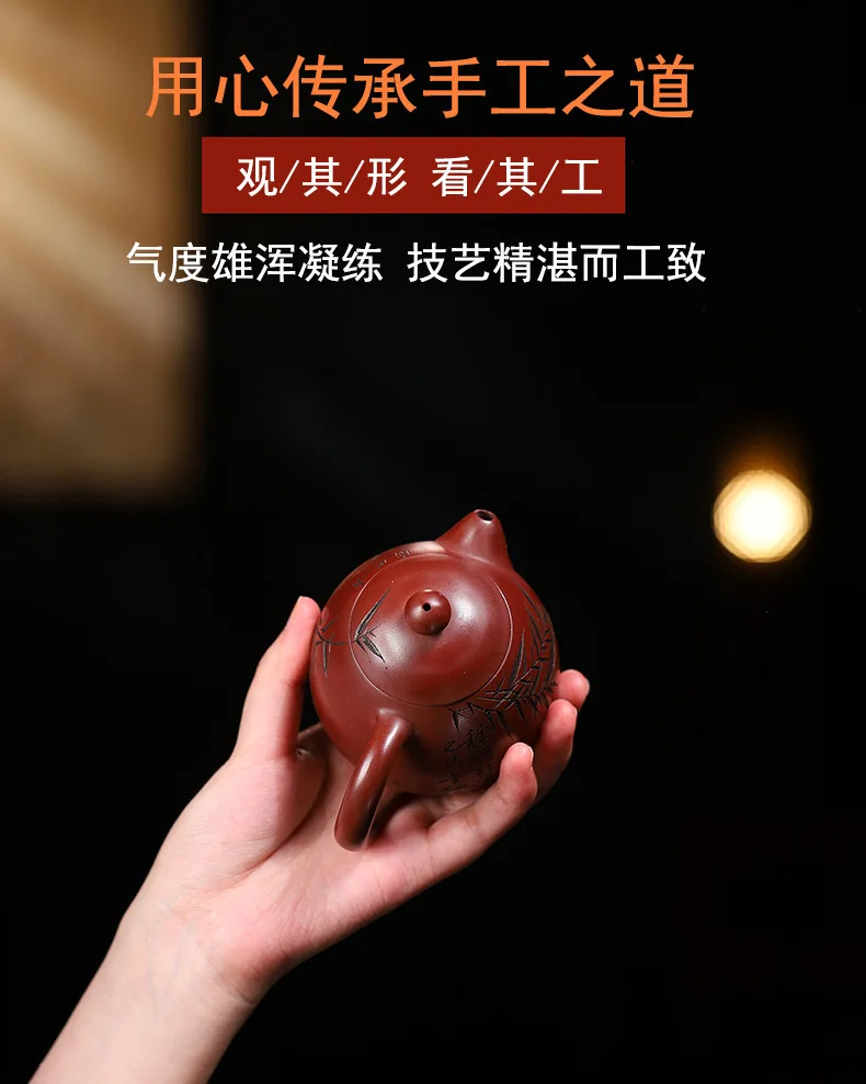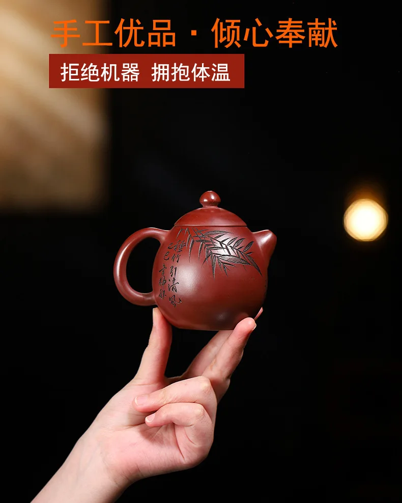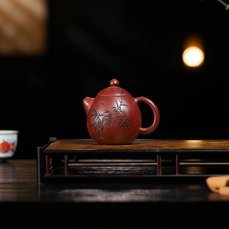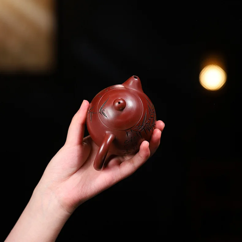 「竹影红袍 · Crimson Bamboo」 — 220ml Handcrafted Yixing Purple Clay Teapot | Xi Shi Form with Carved Bamboo & Big Red Robe Pairing · ybsteapot008 Studio Edition