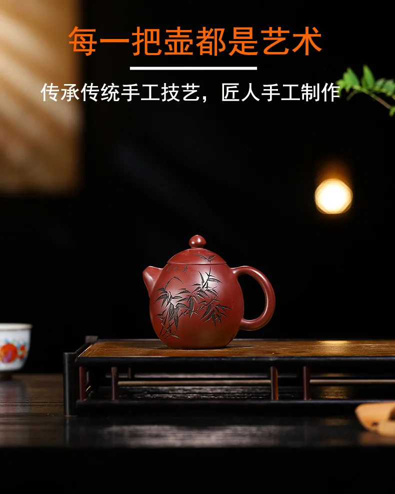 「竹影红袍 · Crimson Bamboo」 — 220ml Handcrafted Yixing Purple Clay Teapot | Xi Shi Form with Carved Bamboo & Big Red Robe Pairing · ybsteapot008 Studio Edition