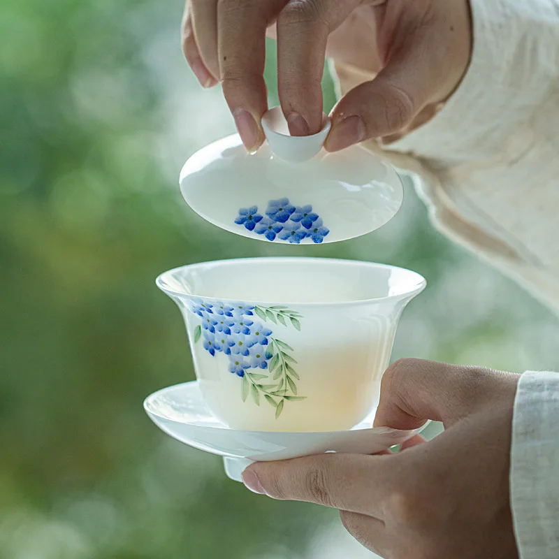 Jade Clay White Porcelain Hand-Painted High-Value Gaiwan Purple Kung Fu Set Household Tea Brewing Bowl Thin-Walled