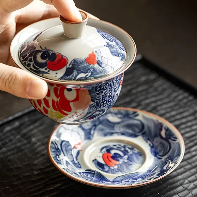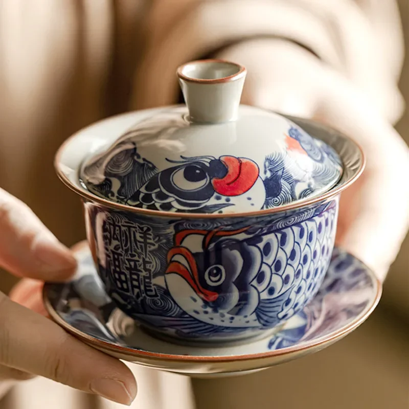 130ml Chinese Blue and White Ceramic Tea Tureen Handmade Fish Gaiwan Beauty Tea Infuser Teacup Household Tea Bowl Teaware