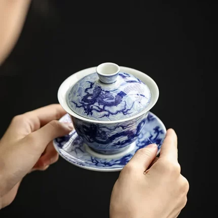 Blue and White Color Dragon Flower Pattern Sancai Gaiwan Tea Tureen Infuser Kitchen Teaware Drinking Accessories