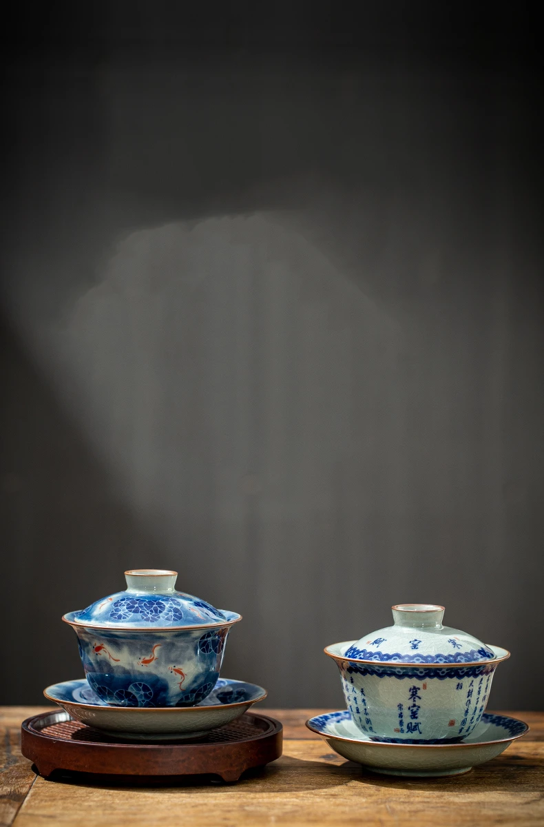Blue and White Porcelain Suspended Lid Bowl Three Talents Bowl Tea Brewing Device Tea Offering Bowl High Aesthetic Company Event