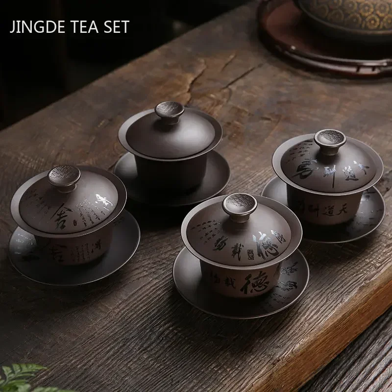 1PCS 160ml Yixing purple sand gaiwan raw mineral purple mud household tea cup hand-painted tea bowl Zen master cup