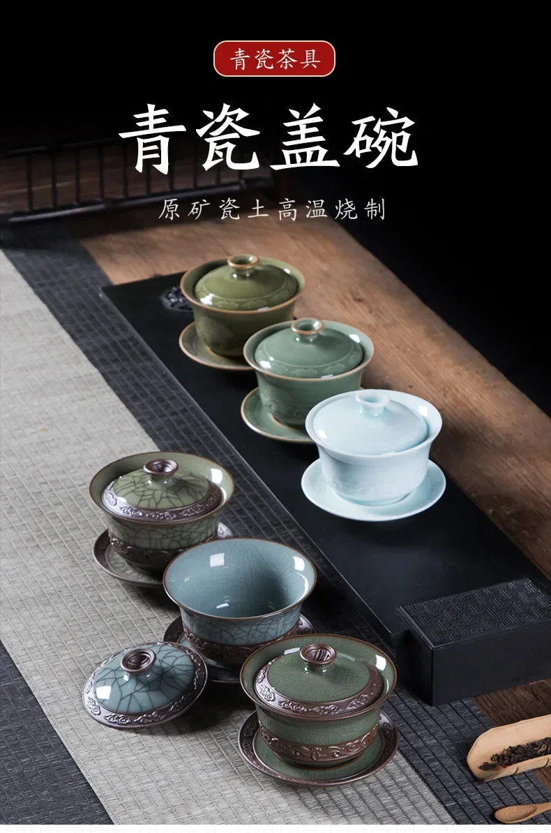 200ml Longquan Celadon Cover Bowl Ge Kiln Ice Cracking Hand Grab Bowl with Lid Kung Fu Teaset Sancai Cover Bowl Tea Maker Gaiwan