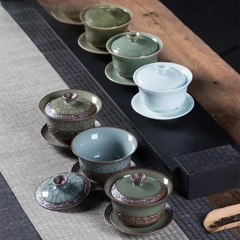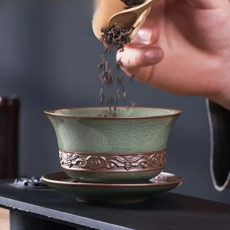 200ml Longquan Celadon Cover Bowl Ge Kiln Ice Cracking Hand Grab Bowl with Lid Kung Fu Teaset Sancai Cover Bowl Tea Maker Gaiwan