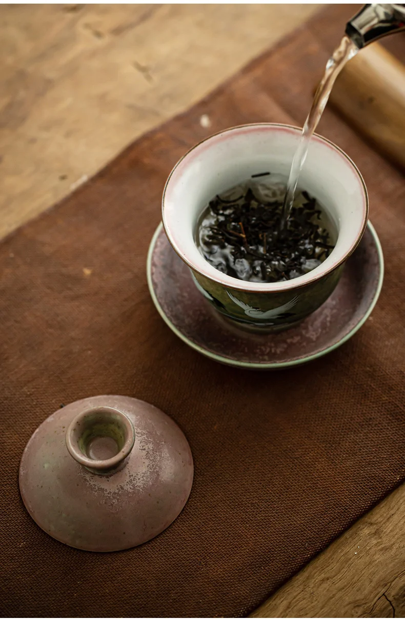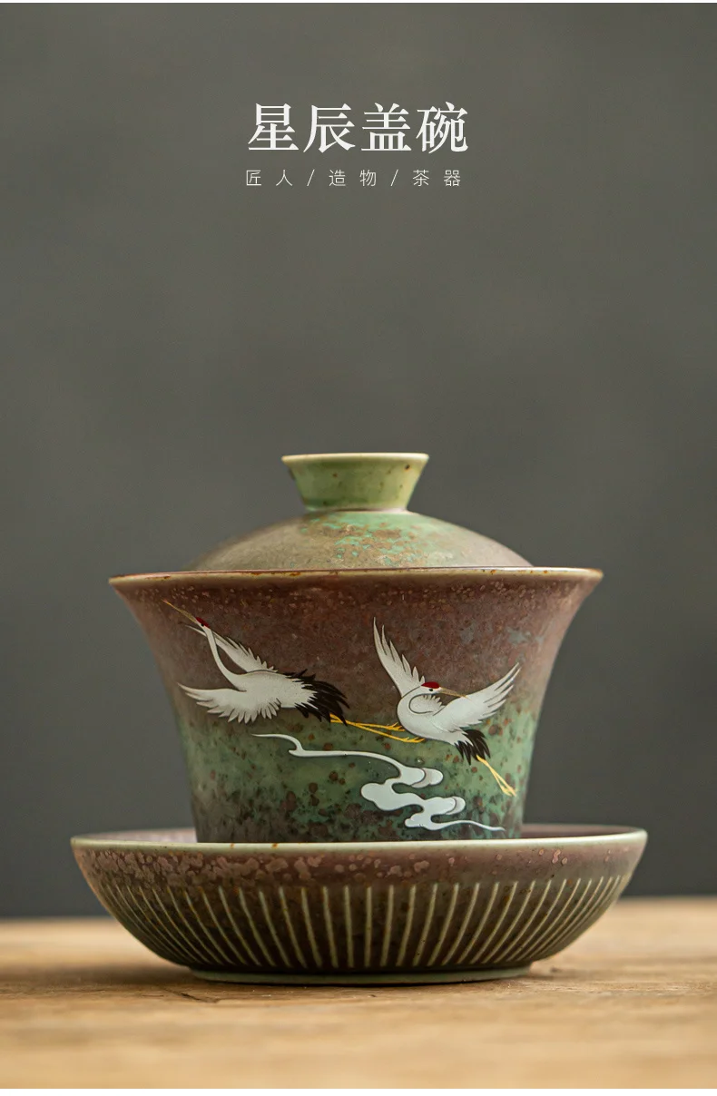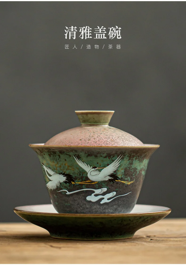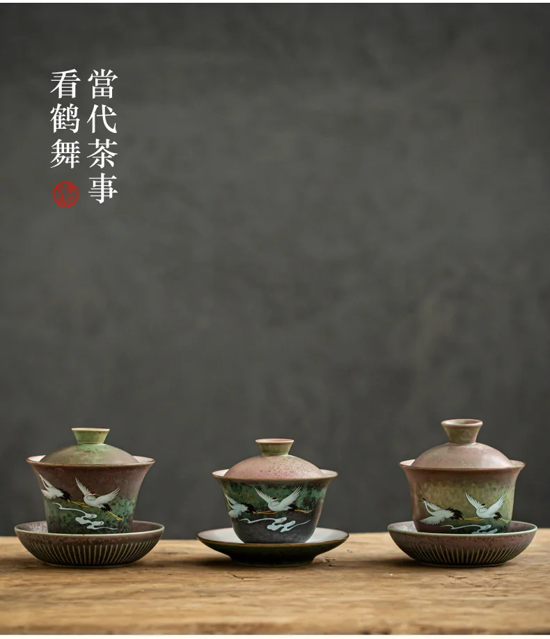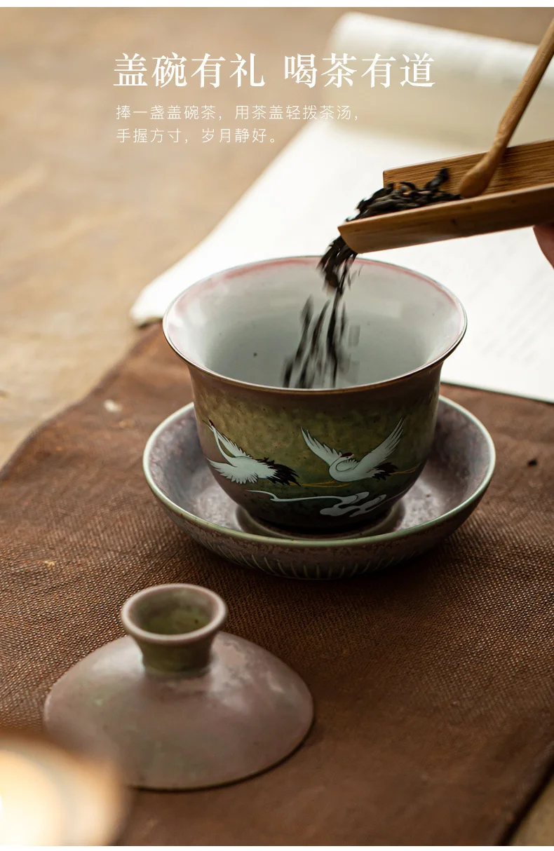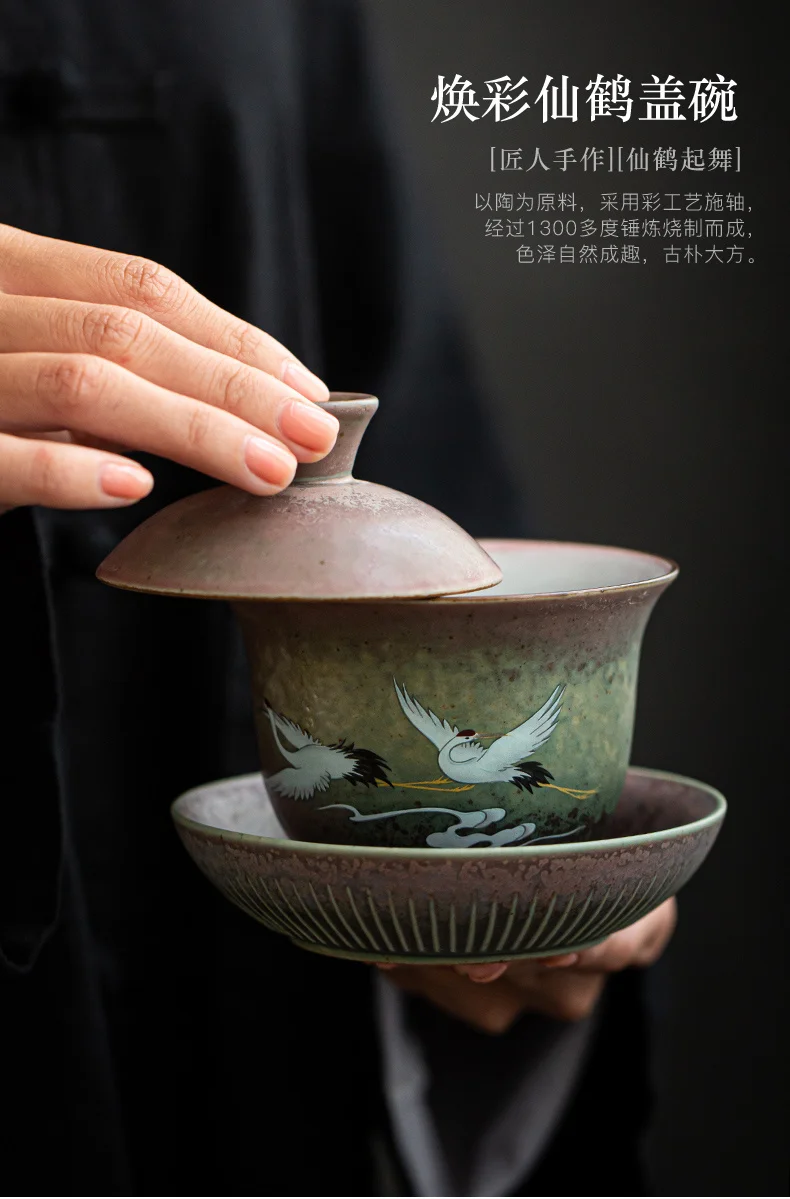 Anti-scald Large Ceramic Retro Tea Cover Bowl with Lid Sancai Gaiwan Single Tea Bowl Hand Painted Shining Crane Cover Bowl