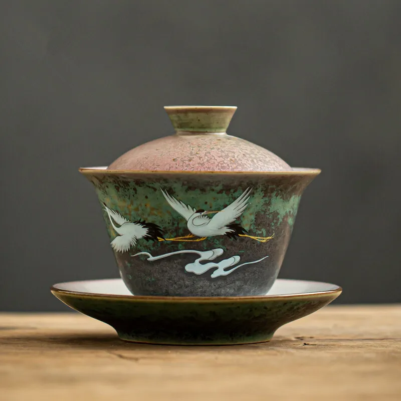 Anti-scald Large Ceramic Retro Tea Cover Bowl with Lid Sancai Gaiwan Single Tea Bowl Hand Painted Shining Crane Cover Bowl
