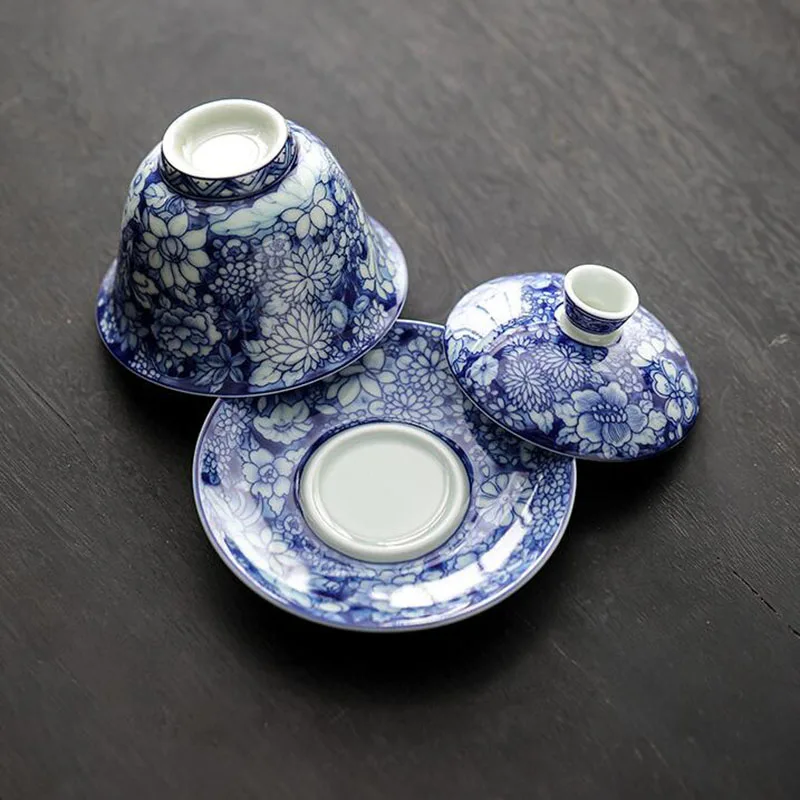 Blue and White Color Dragon Flower Pattern Sancai Gaiwan Tea Tureen Infuser Kitchen Teaware Drinking Accessories